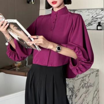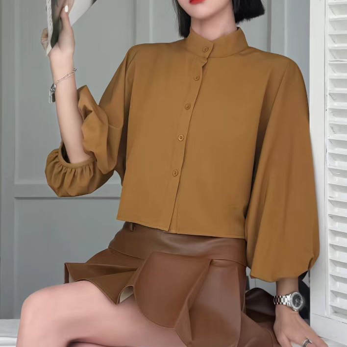 FA43678# 时尚不规则设计感前短后长立领单排扣灯笼袖衬衫宽松上衣 服裝批發女裝批發服飾貨源