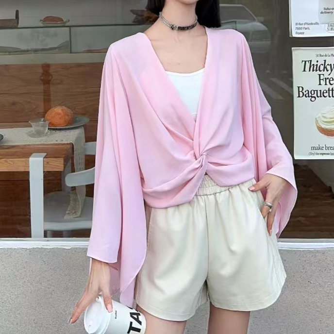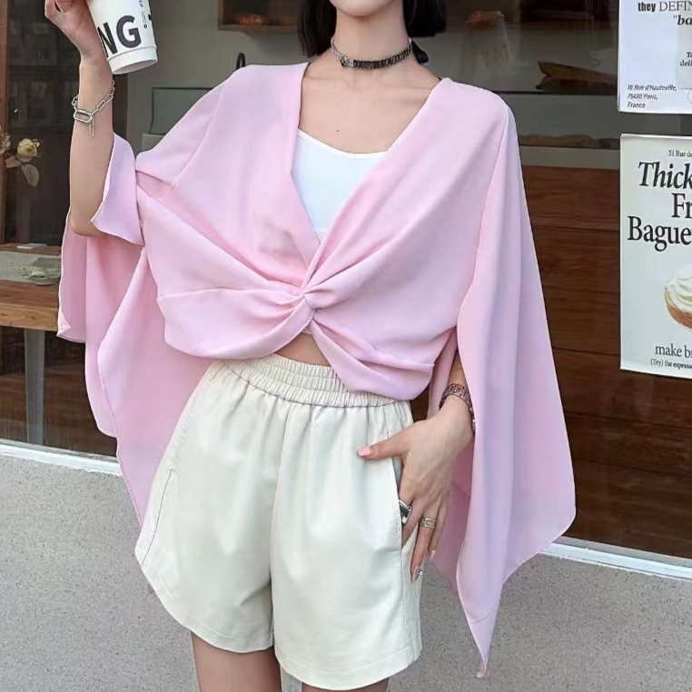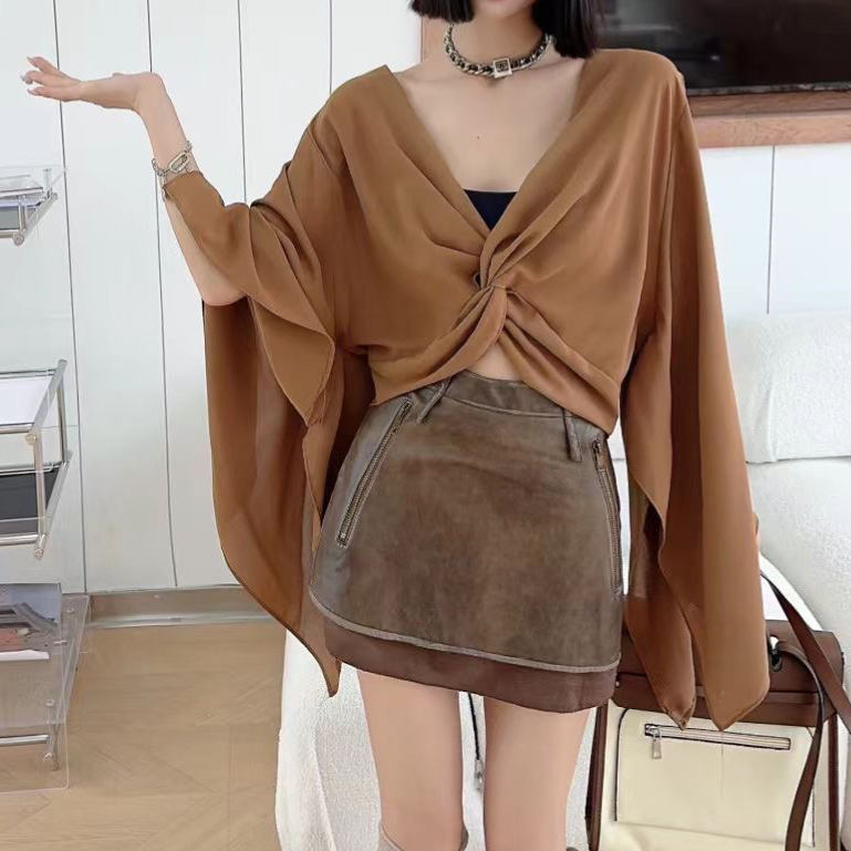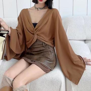 FA43680# 秋新款小众设计感V领扭结喇叭长袖衬衫法式短款雪纺上衣 服裝批發女裝批發服飾貨源