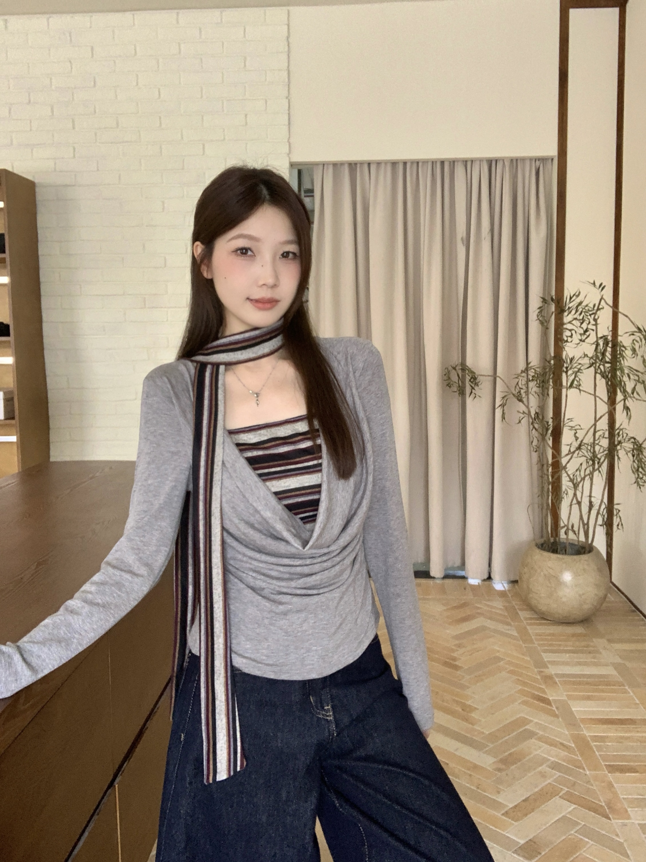 FA43688# 大码女装秋冬新款复古条纹撞色假两件荡领飘带修身显瘦上衣 服裝批發女裝批發服飾貨源