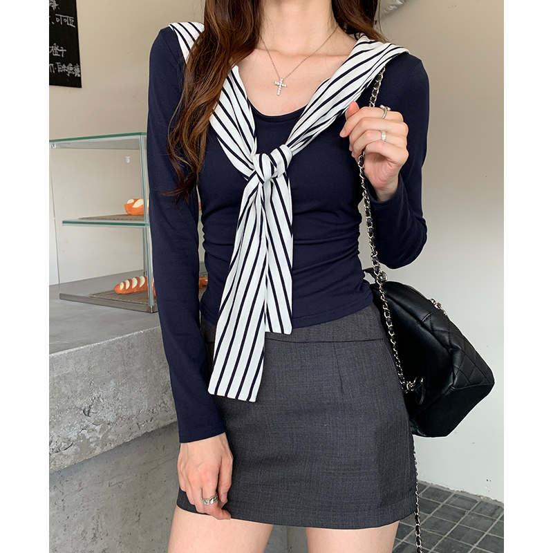 FA43690# 蓝色条纹披肩v领t恤女早秋高级感韩系修身打底内搭褶皱 服裝批發女裝批發服飾貨源