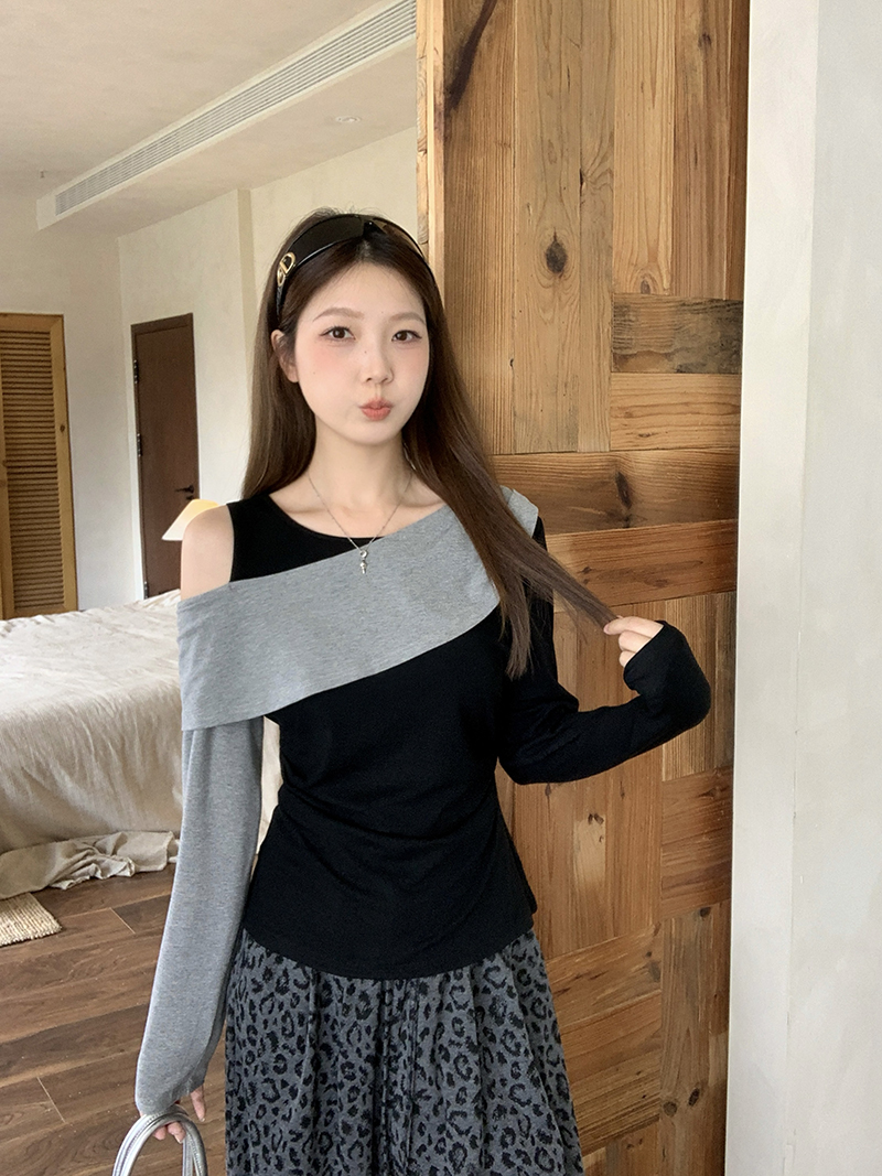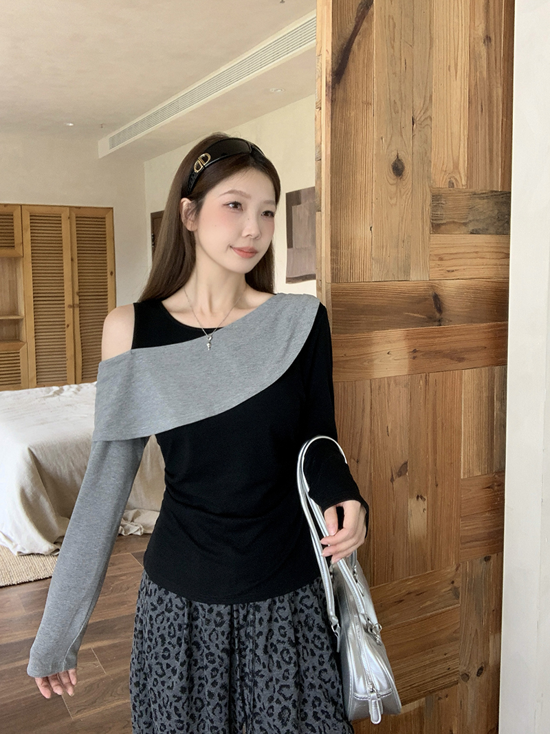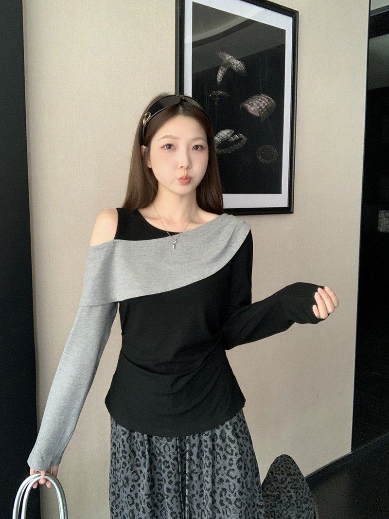 FA43729# 秋装新款胖mm大码女撞色设计感露肩修身显瘦长袖上衣 服裝批發女裝批發服飾貨源