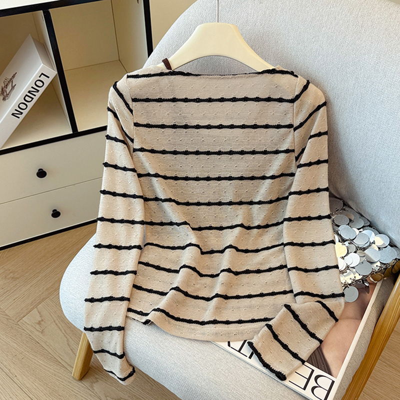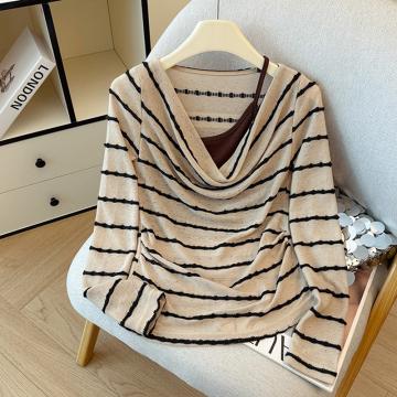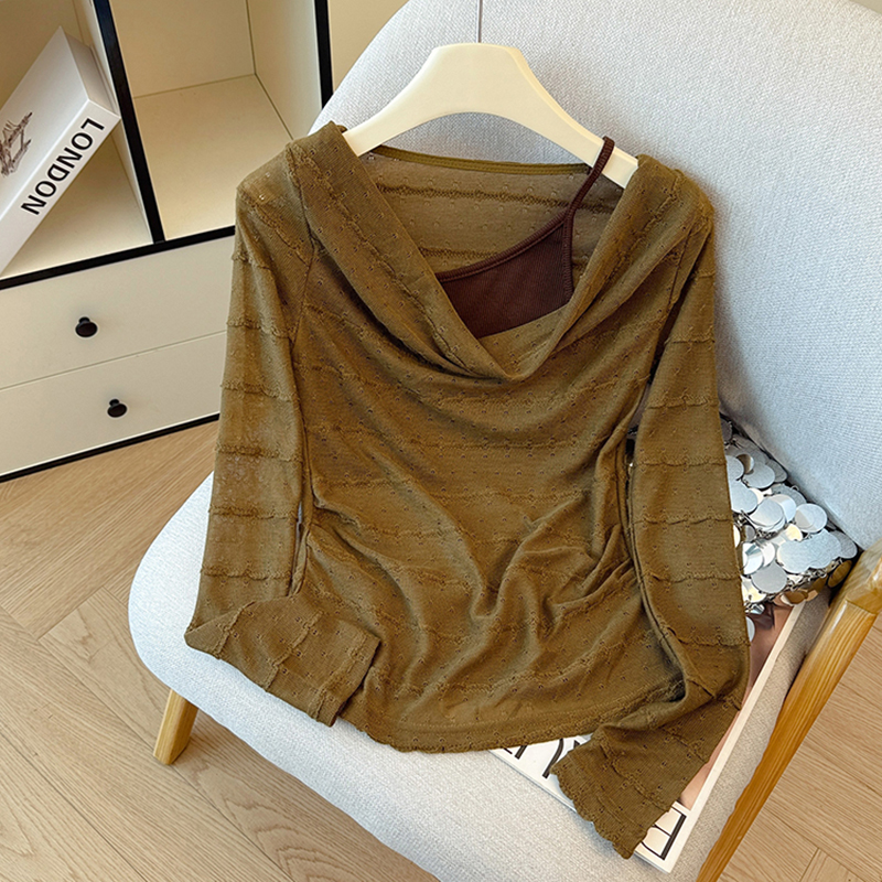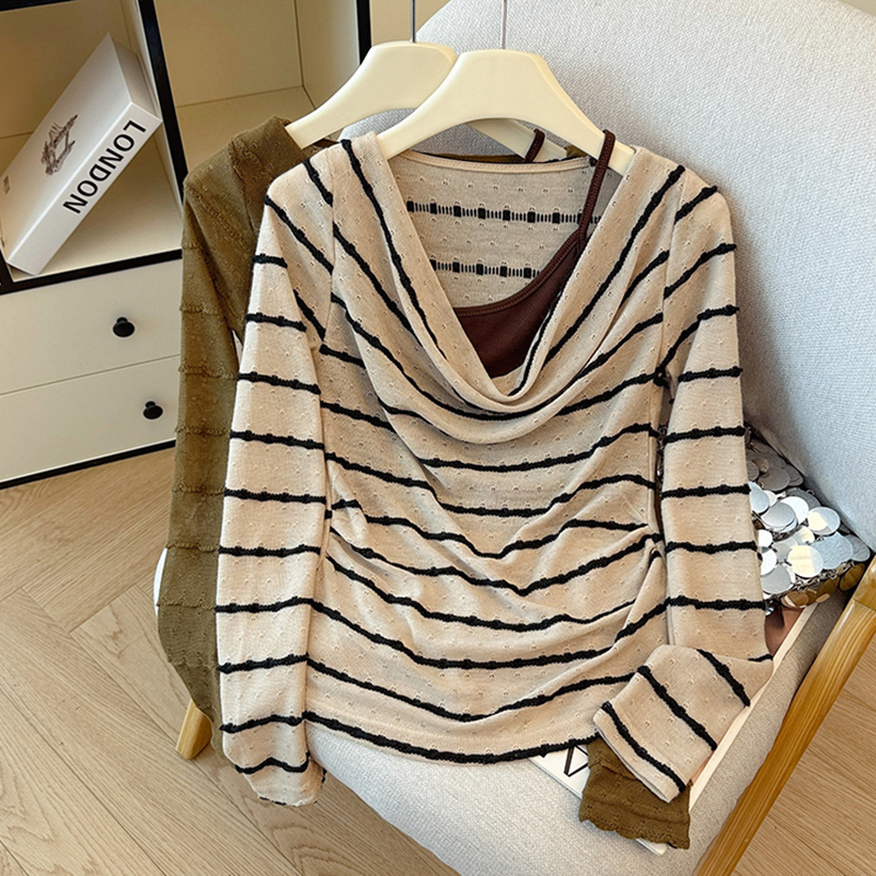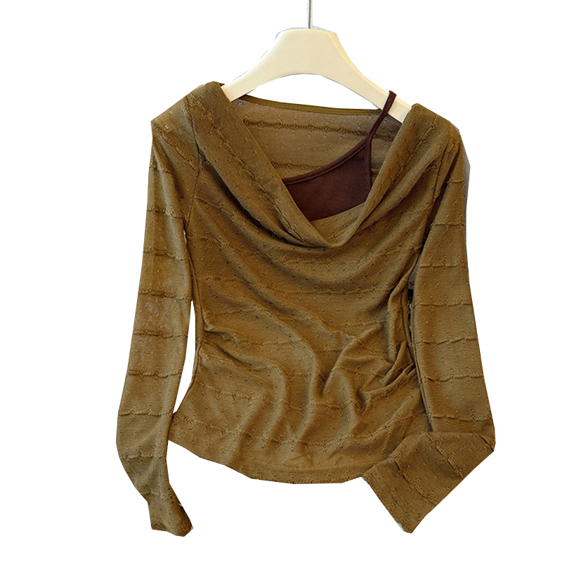 FA43787# 韩系设计感撞色假两件长袖t恤女秋季新款荡领显瘦气质小衫 服裝批發女裝批發服飾貨源