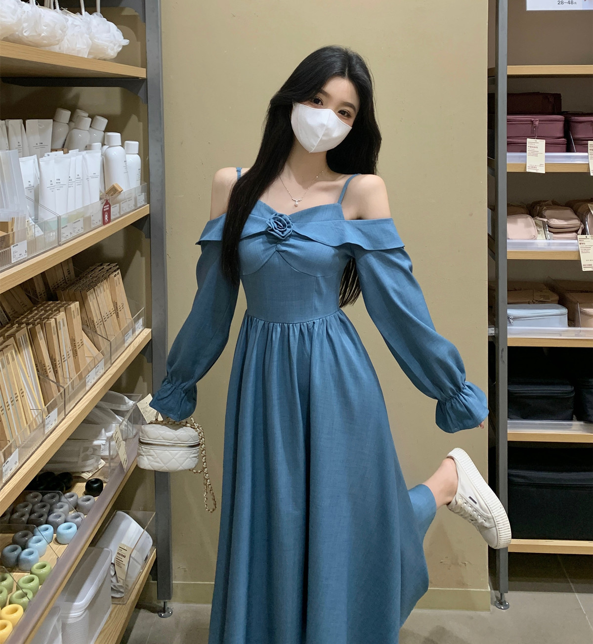 FA43870# 早秋胖mm大码赫本风气质一字肩长袖连衣裙高腰遮肉显瘦中长裙 服裝批發女裝批發服飾貨源