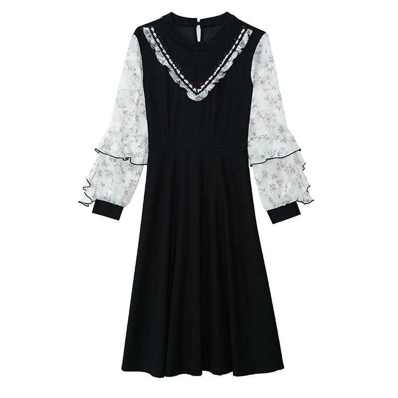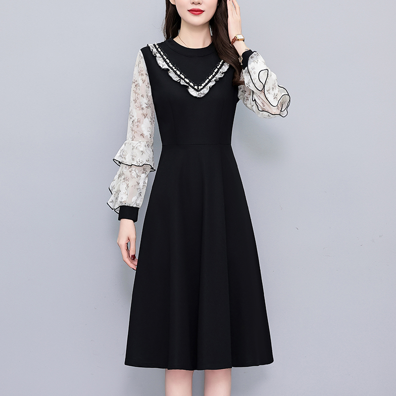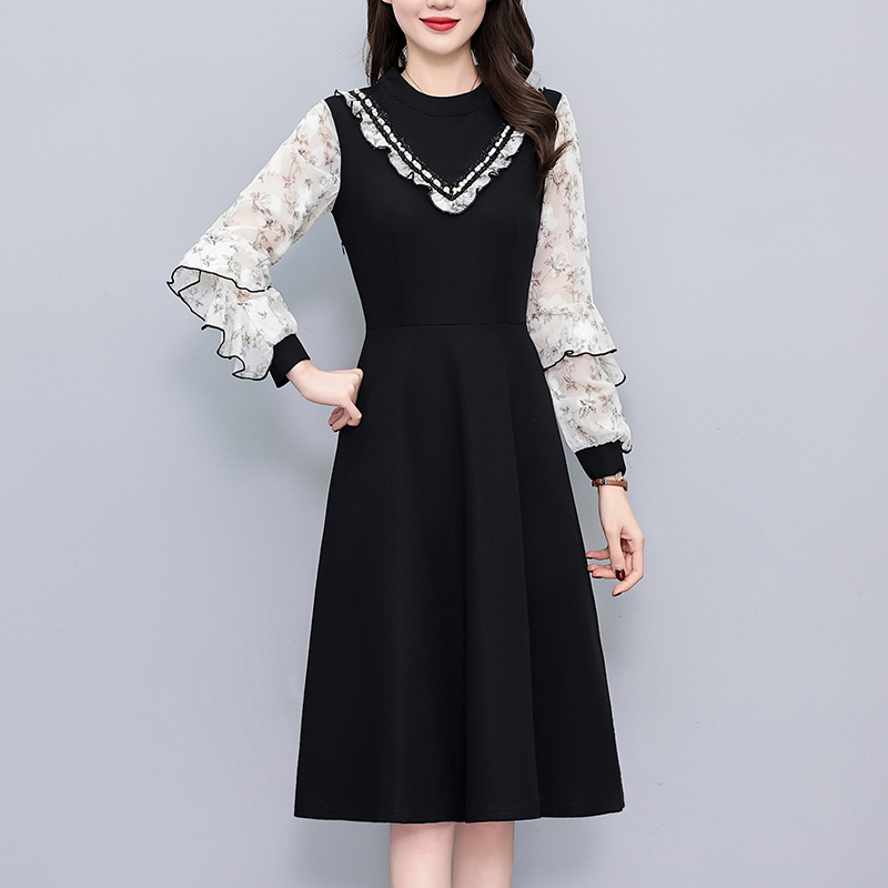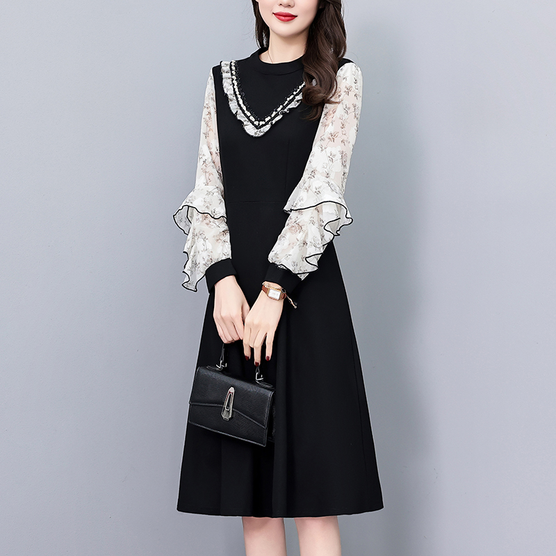 FA43896# 雪纺印花假两件套修身中长款大码女装胖mm胖妹妹洋气长袖连衣裙春 服裝批發女裝批發服飾貨源
