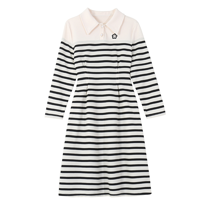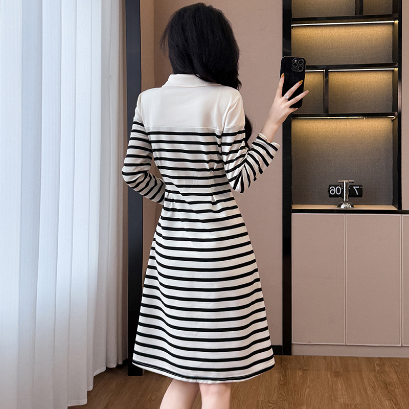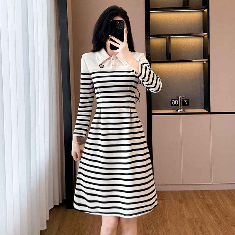 FA43901# 条纹拼接大码女装胖mm时尚洋气修身显瘦长袖连衣裙春秋新款阔太太 服裝批發女裝批發服飾貨源