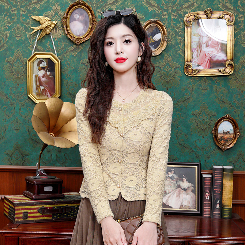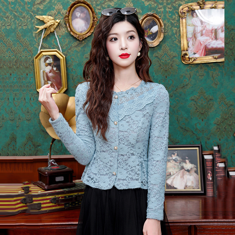 FA43968# 时尚长袖磨毛蕾丝衬衫女新款百搭修身显瘦打底衫上衣 服裝批發女裝批發服飾貨源