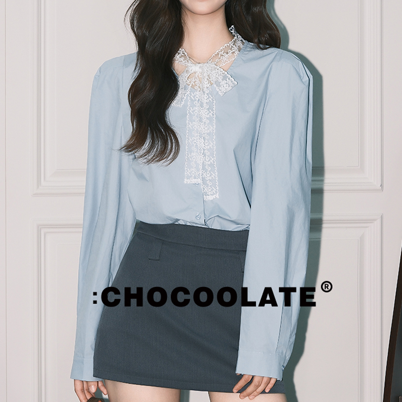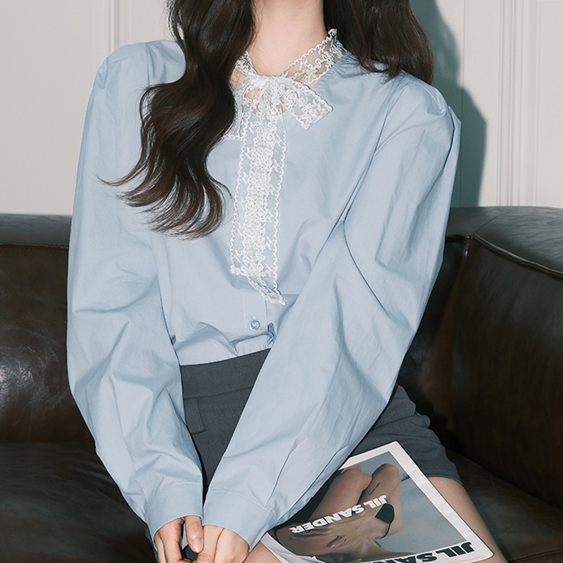FA43972# 秋冬装新款气质浅蓝色V领长袖衬衫女独特蕾丝蝴蝶结法式上衣 服裝批發女裝批發服飾貨源