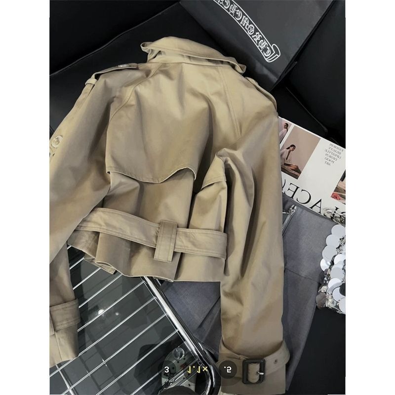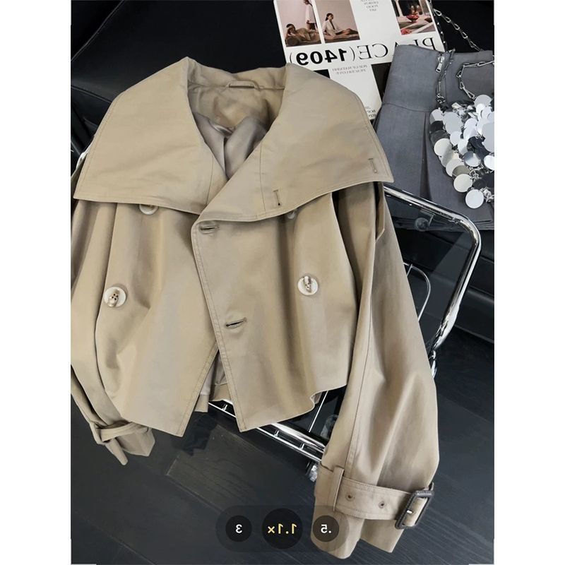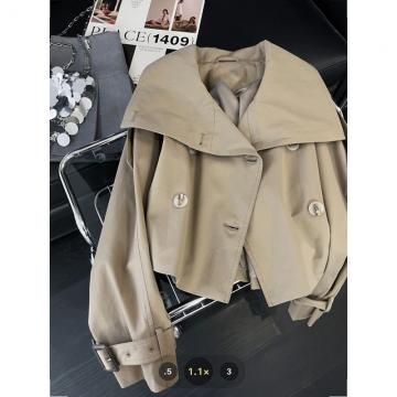 FA43976# 卡其色短款风衣外套女韩系复古酷飒风立领双排扣小个子衬衫上衣秋 服裝批發女裝批發服飾貨源