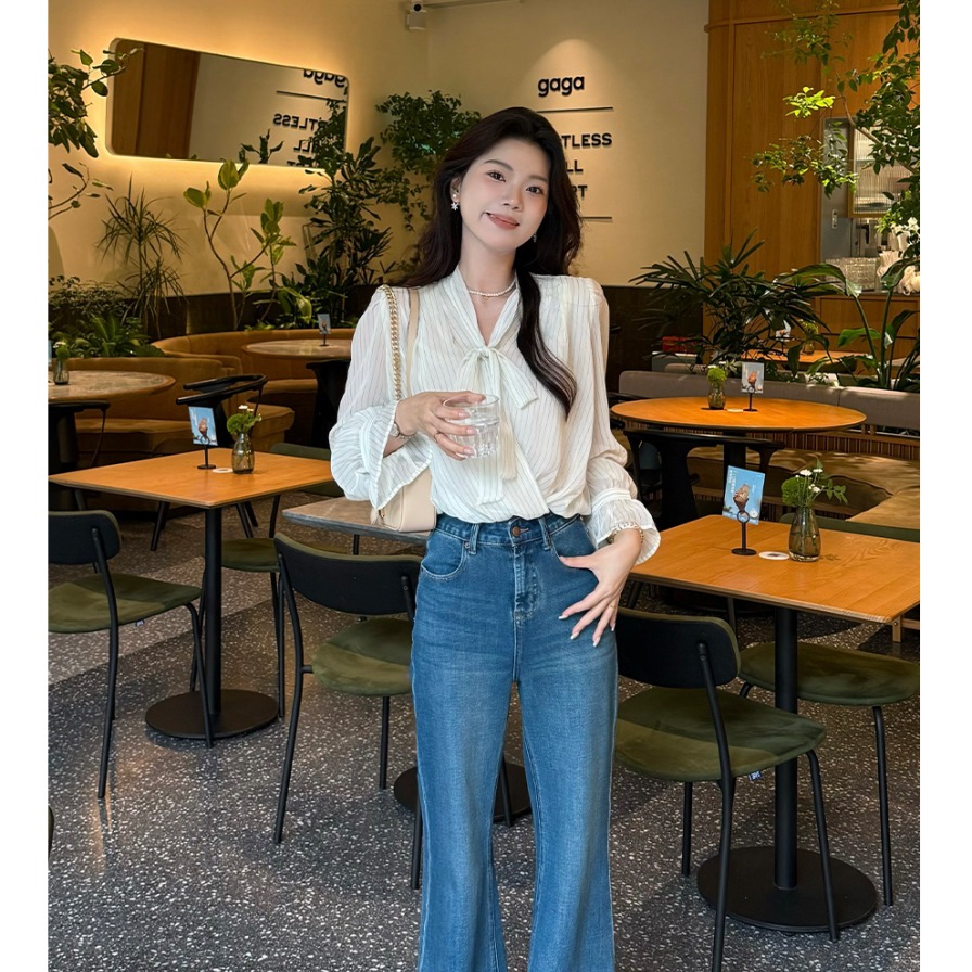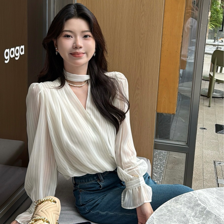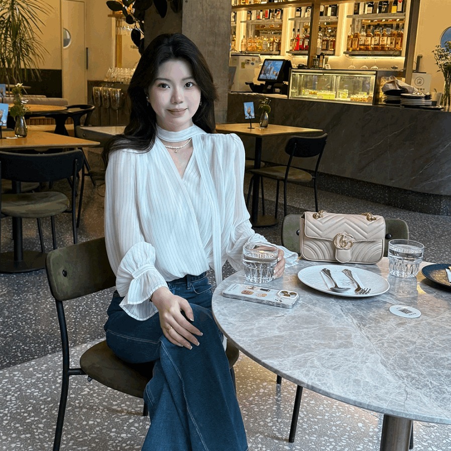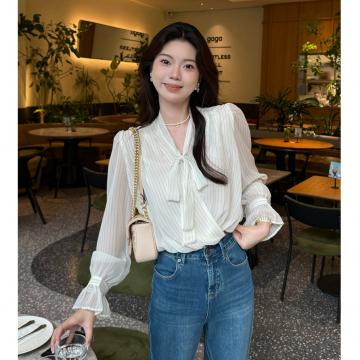FA43981# 时尚百搭韩系气质飘带条纹衬衫薄款V领喇叭袖小众设计感上衣 服裝批發女裝批發服飾貨源