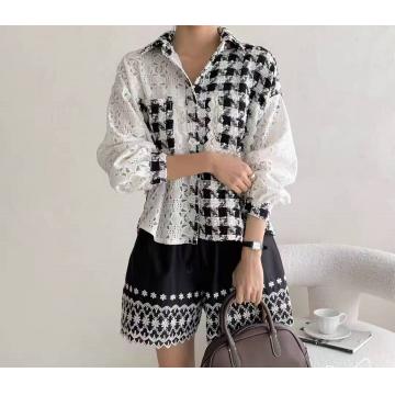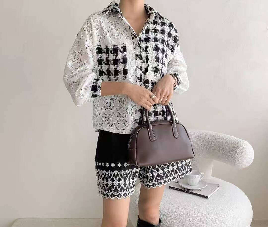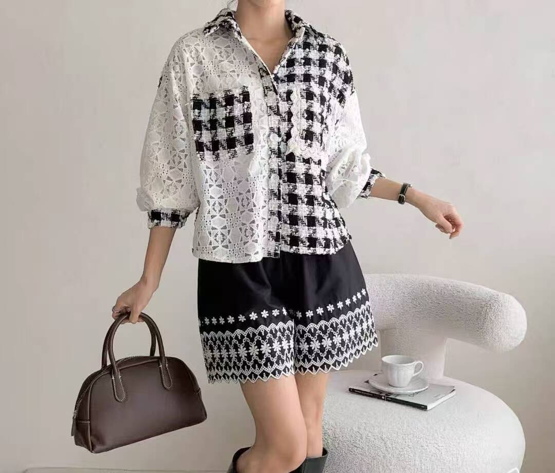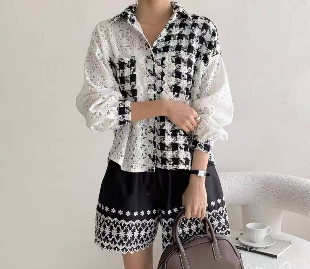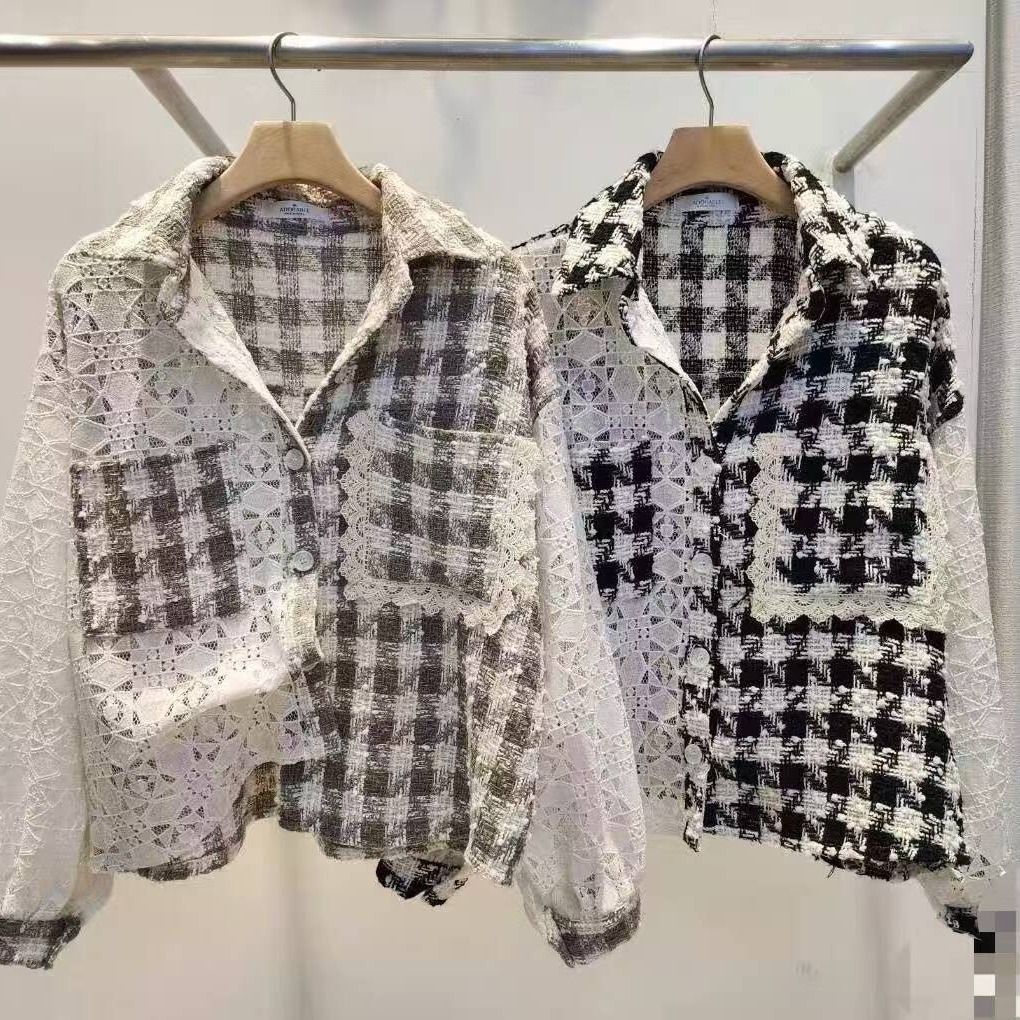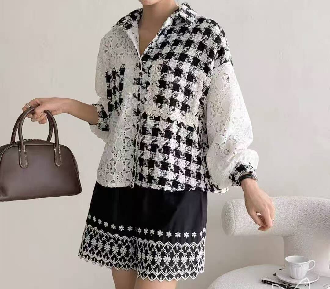 FA43996# 韩国东大门秋季女装新款时尚翻领花边双贴袋甜美撞色格子衬衫 服裝批發女裝批發服飾貨源