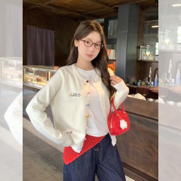 FA44010# 圆领长袖毛针织开衫外套女秋季穿搭纽扣刺绣宽松显瘦上衣 服裝批發女裝批發服飾貨源