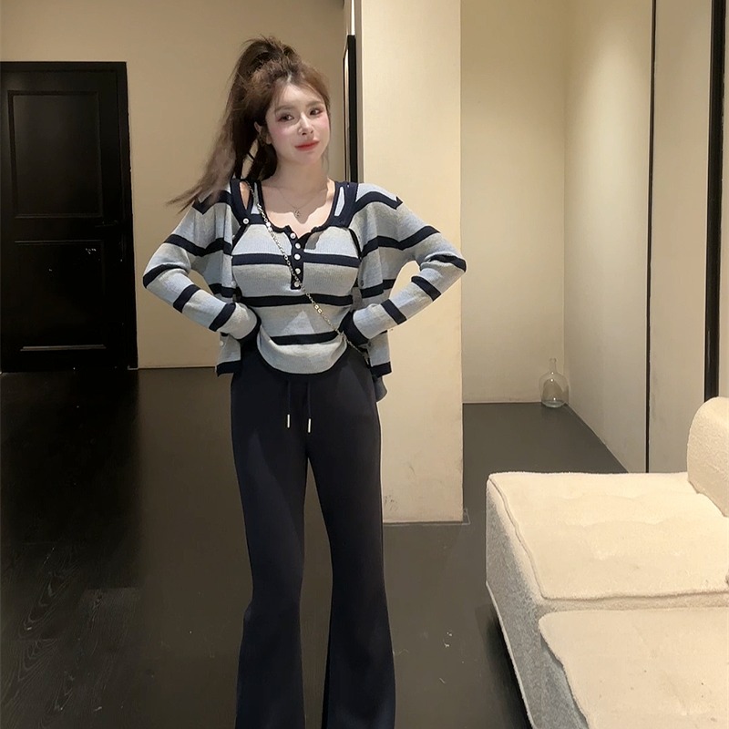 Home > 长袖T恤 > FA44080# 秋冬新款韩版条纹拼色小众吊带带胸垫+开衫休闲两件套 服裝批發女裝批發服飾貨源