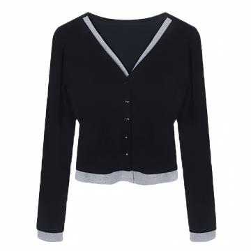 FA44154# 显瘦针织开衫上衣V领假两件黑色长袖T恤女春秋新款修身内搭打底衫 服裝批發女裝批發服飾貨源