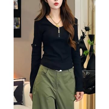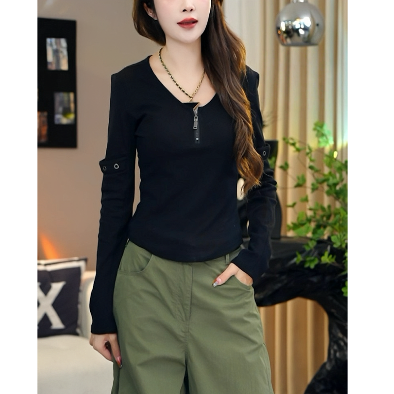 秋款V领半拉链打底衫女装胖mm长袖t恤修身显瘦大码德绒上衣 服裝批發女裝批發服飾貨源