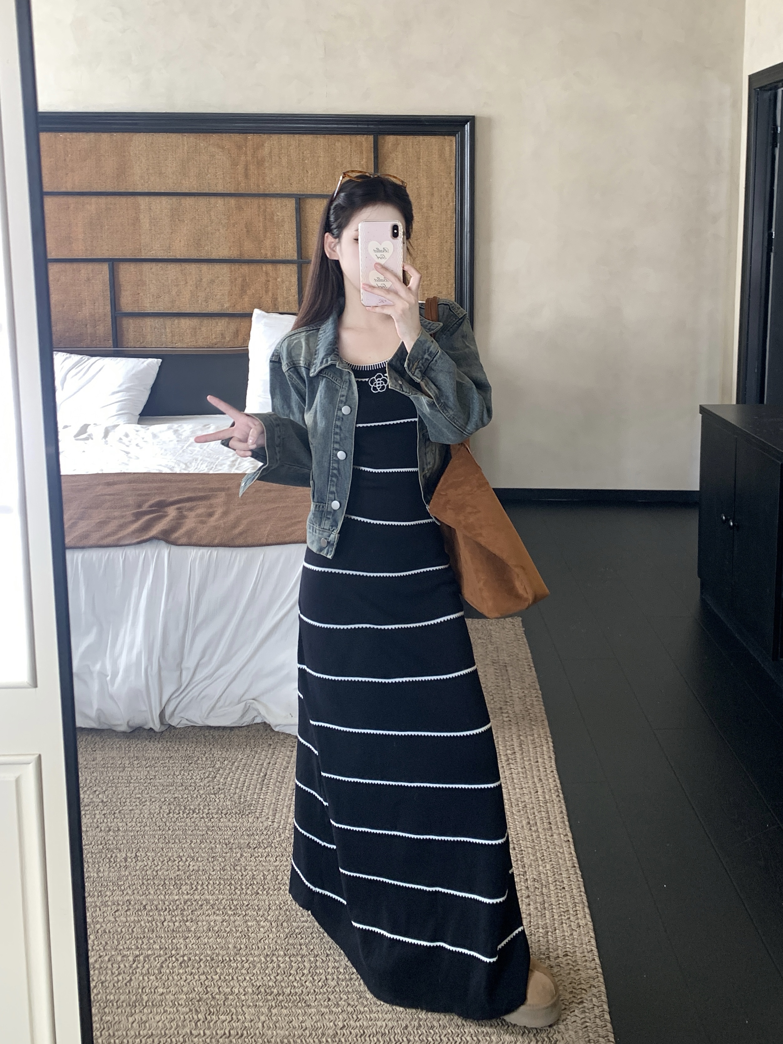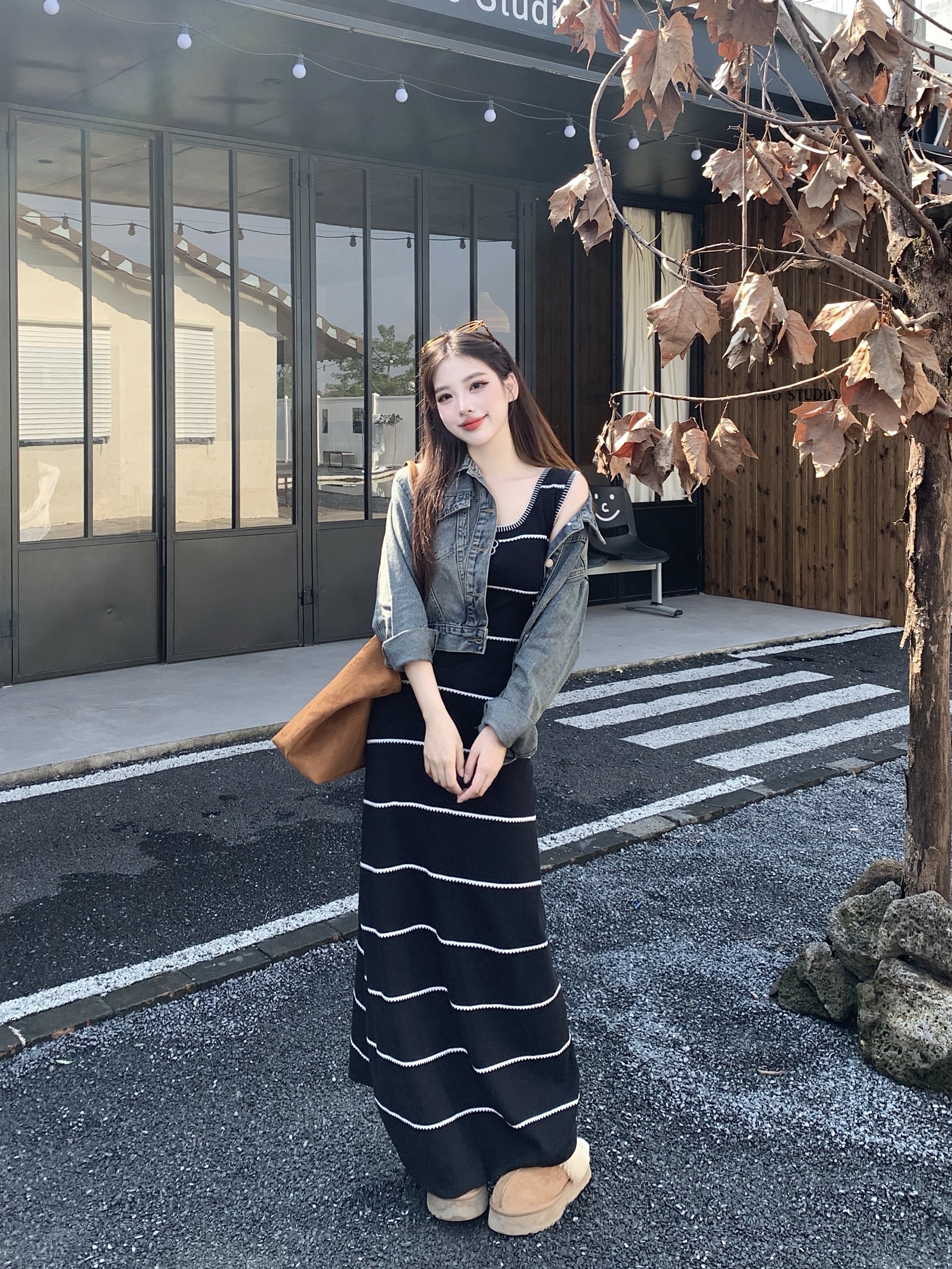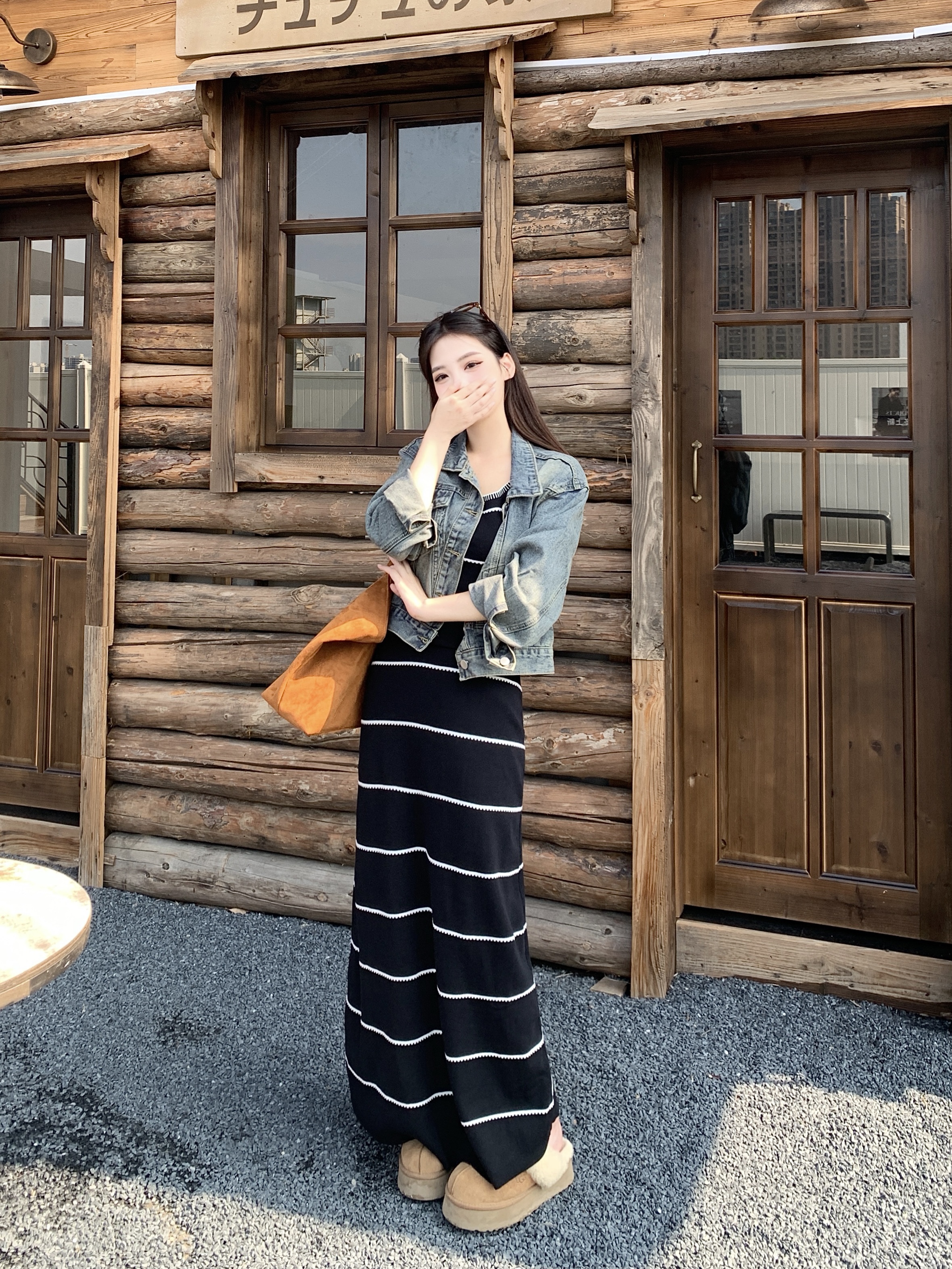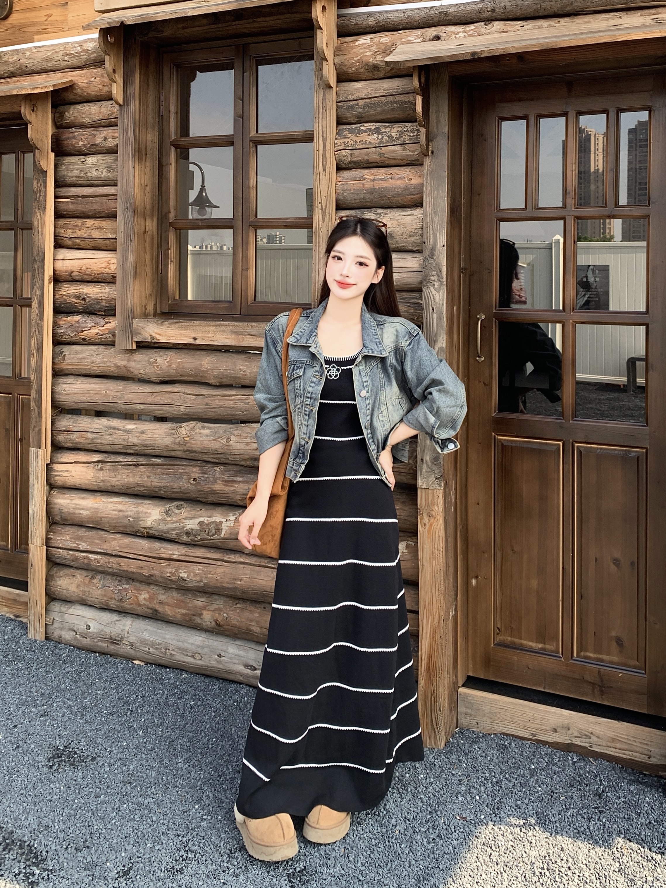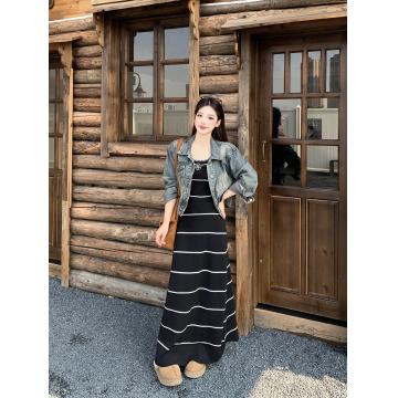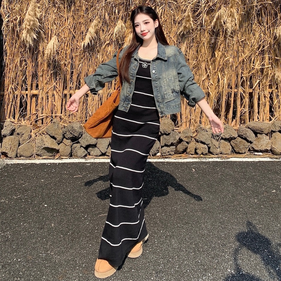 FA44240# 法式小香风毛针织条纹撞色性感吊带裙+牛仔外套秋冬时尚套装 服裝批發女裝批發服飾貨源