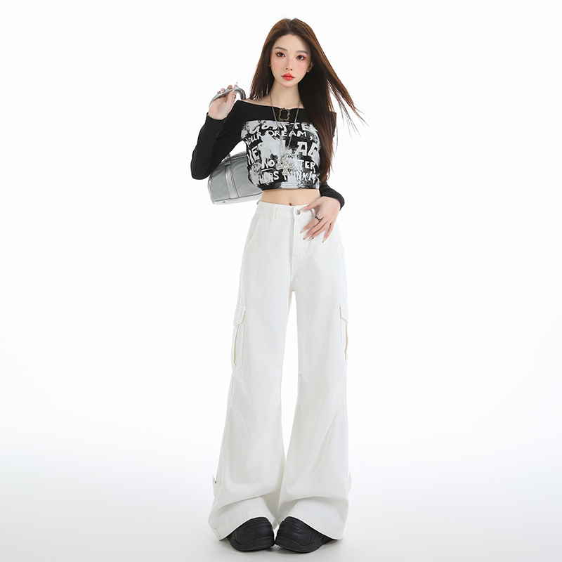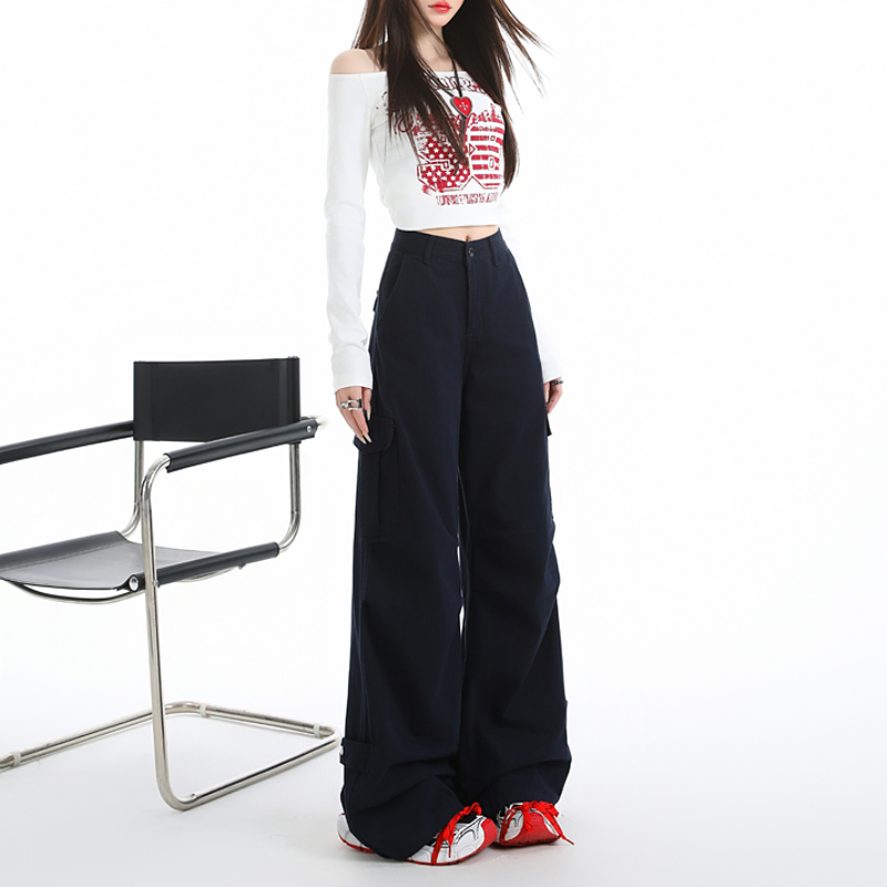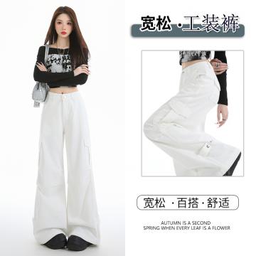 Home > 牛仔裤、长裤 > FA44360# 宝蓝色白色工装牛仔裤女新款高腰宽松设计感可收脚口阔腿裤 服裝批發女裝批發服飾貨源