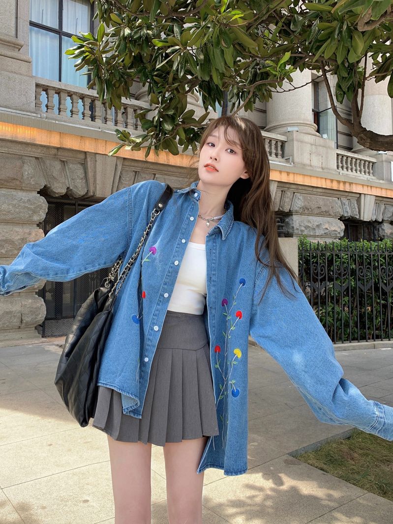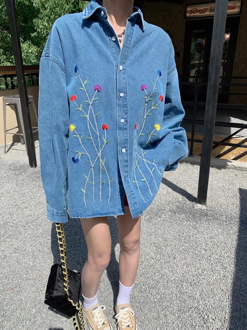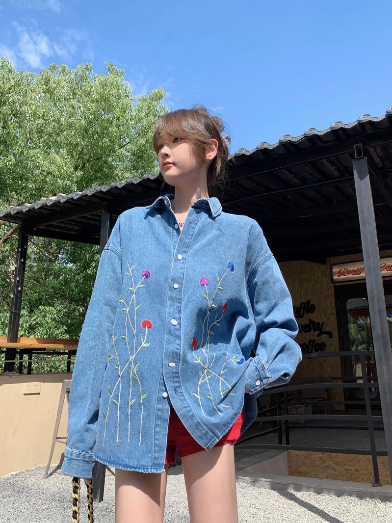 FA44457# 韩版复古藤蔓刺绣牛仔衬衫女新款早秋宽松设计感上衣外套ins 服裝批發女裝批發服飾貨源