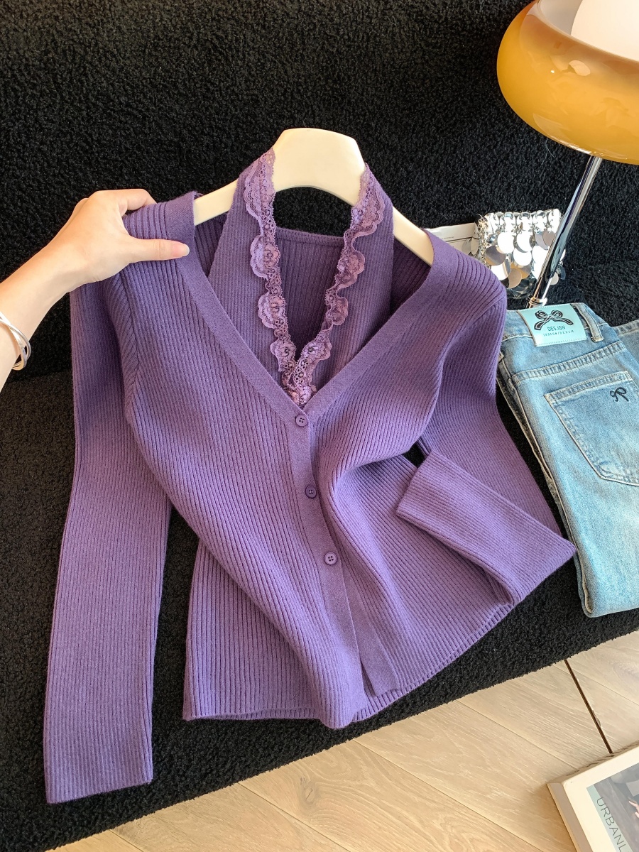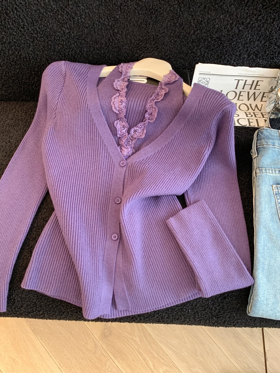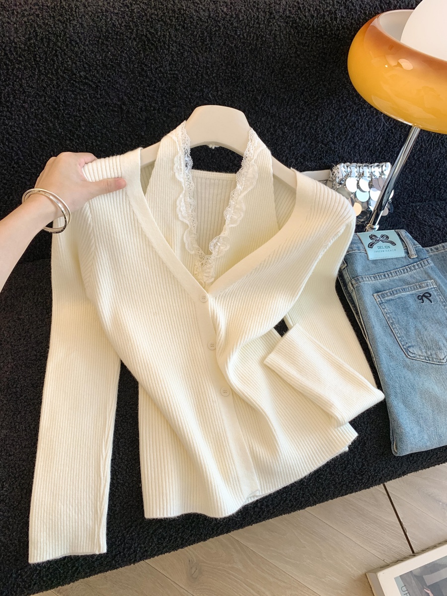FA44471# 新款韩版修身蕾丝拼接假两件挂脖显瘦百搭针织衫 服裝批發女裝批發服飾貨源
