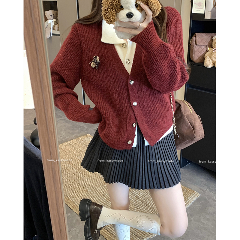 FA44487# 美拉德翻领正肩毛衣外套女新款假两件针织开衫 服裝批發女裝批發服飾貨源