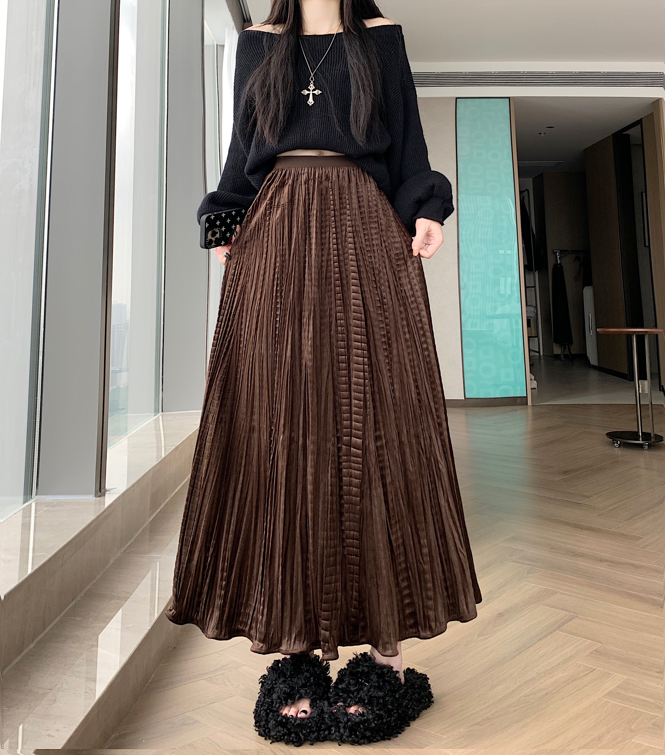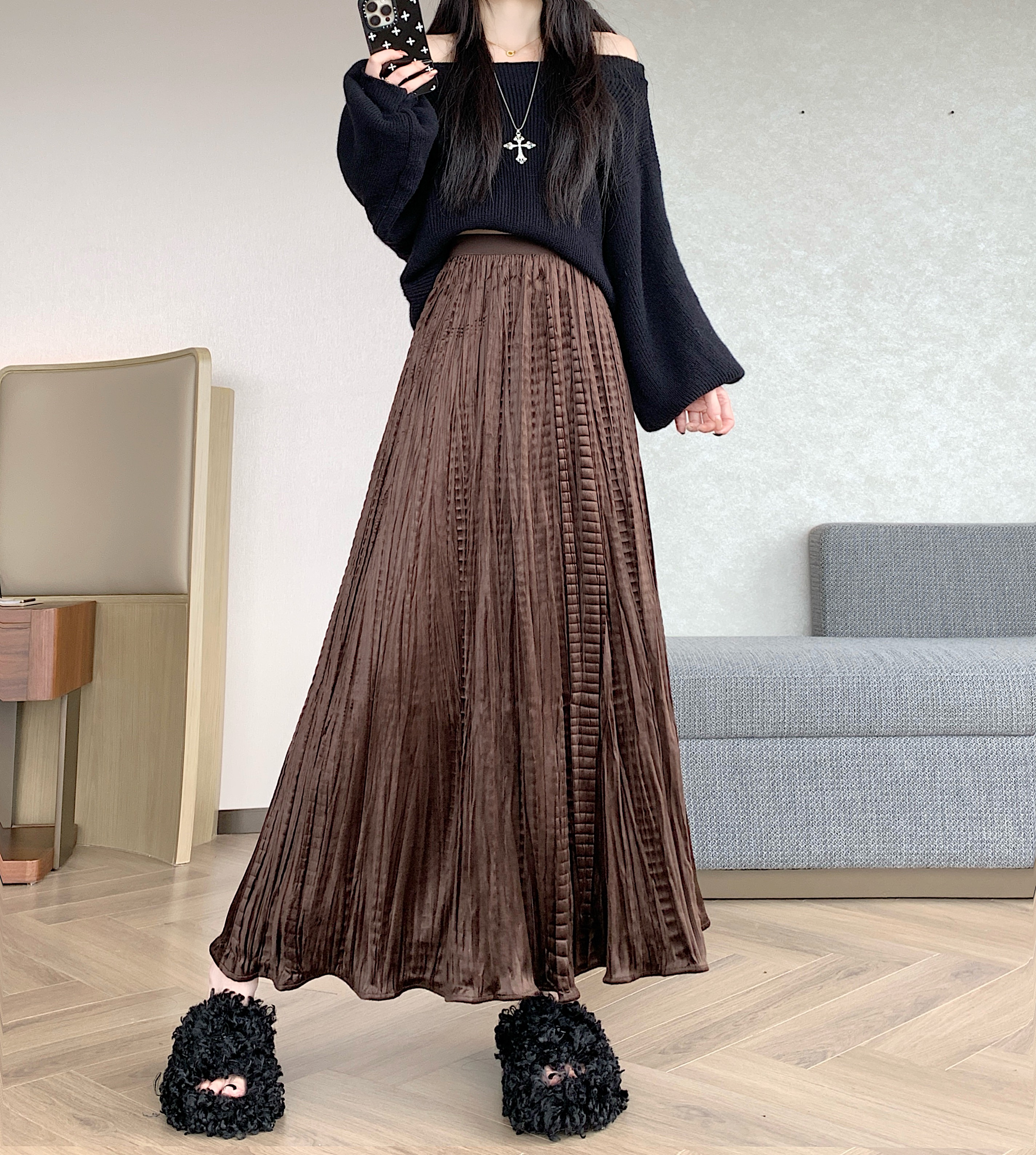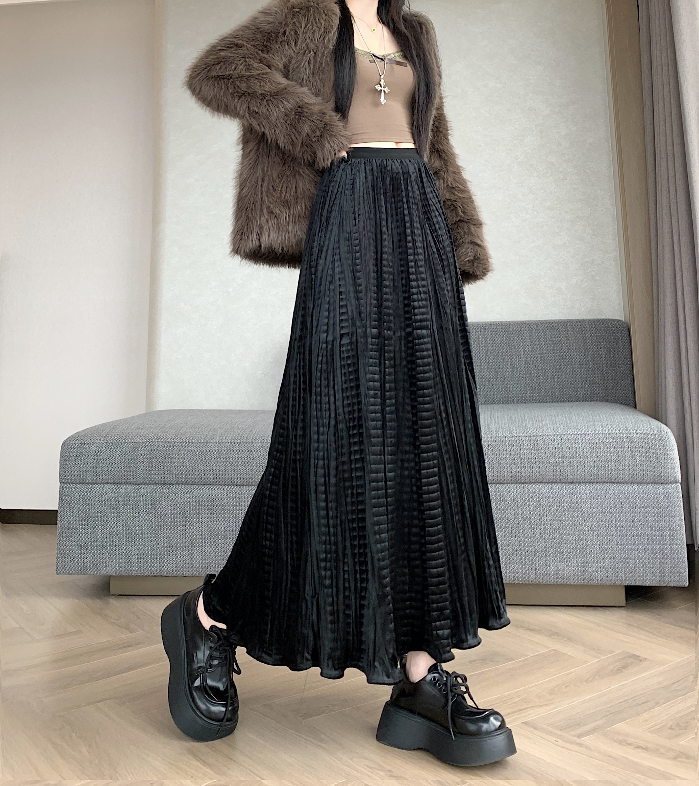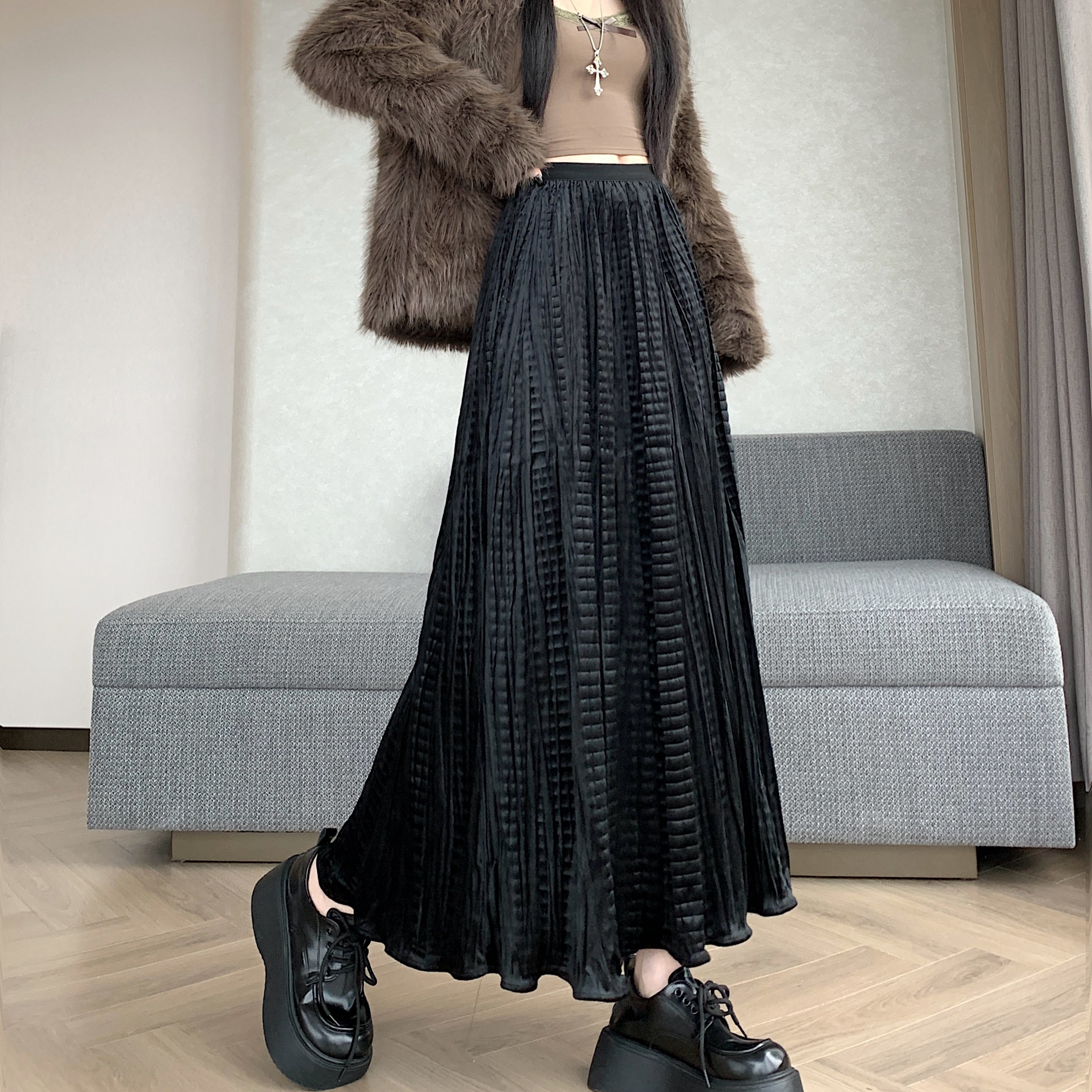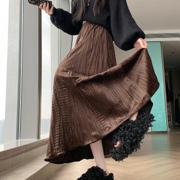 FA44502# 大码胖MM秋冬新款设计感法式小众松弛感褶皱半身裙A字大摆裙 服裝批發女裝批發服飾貨源