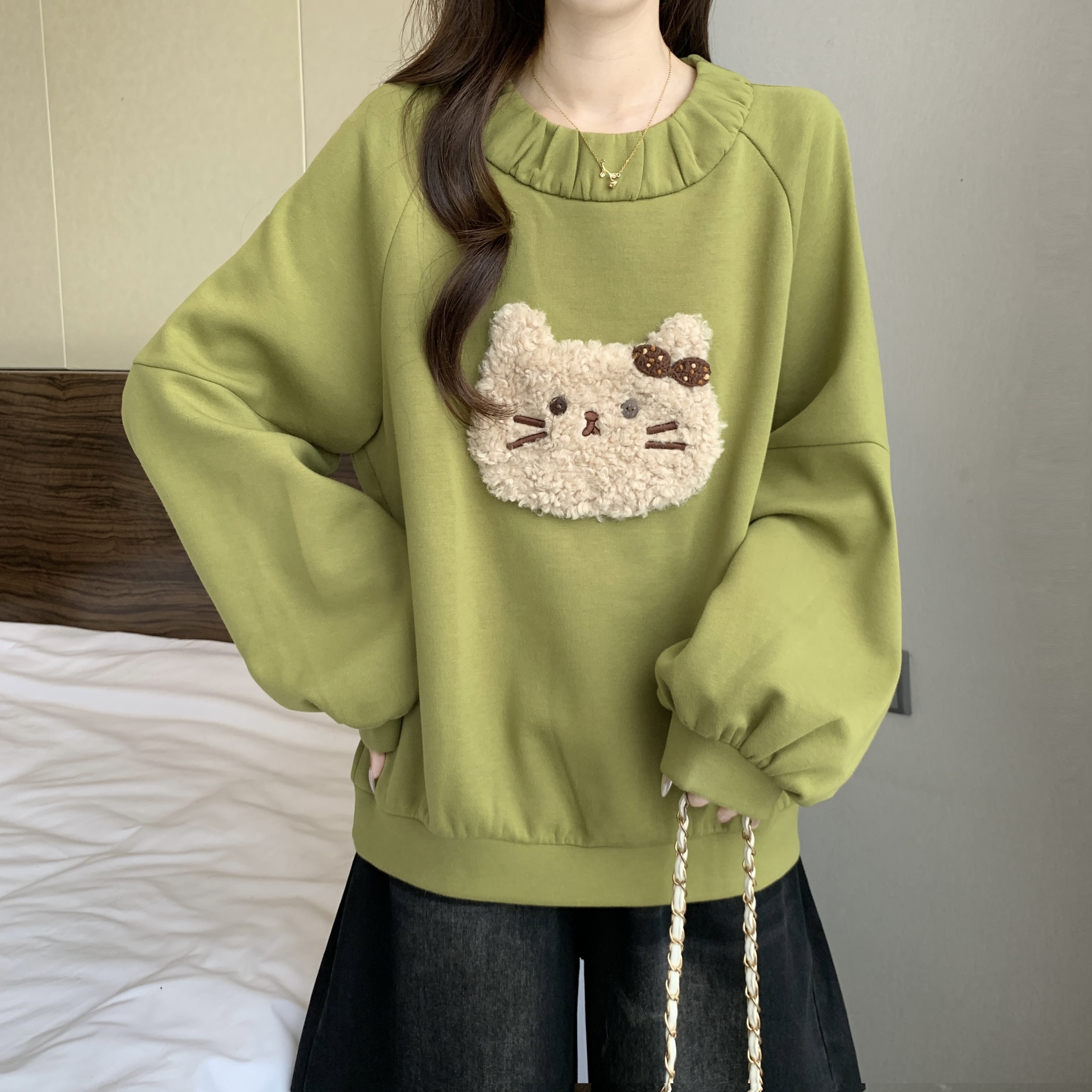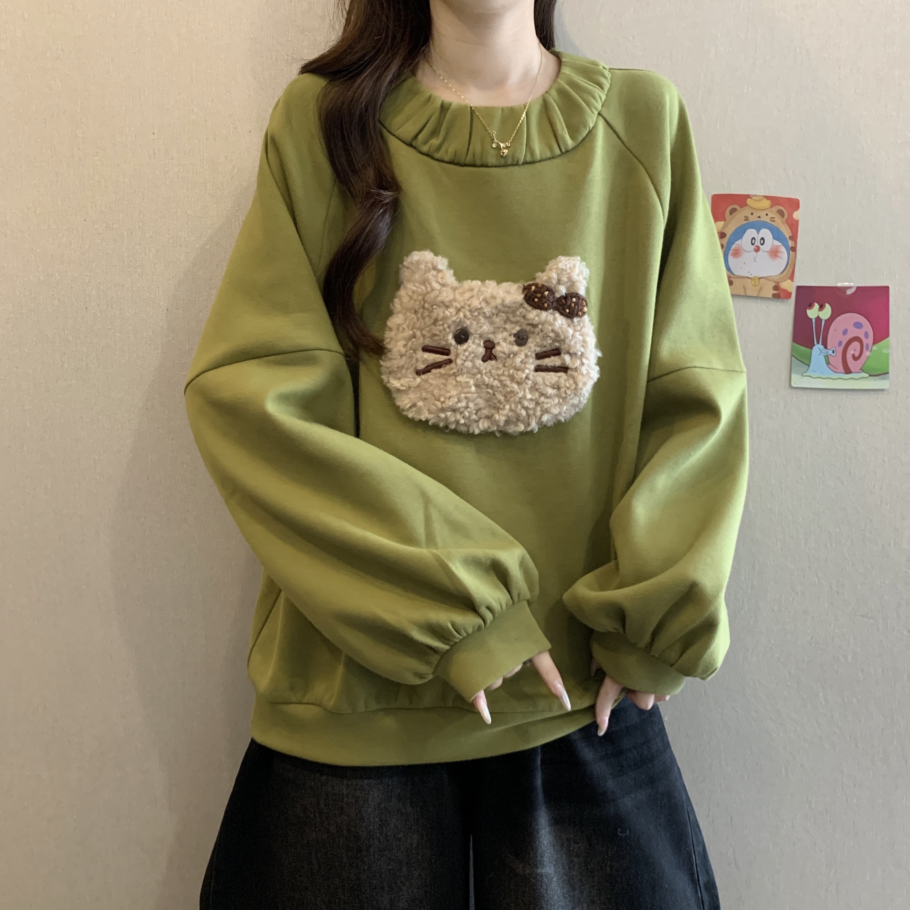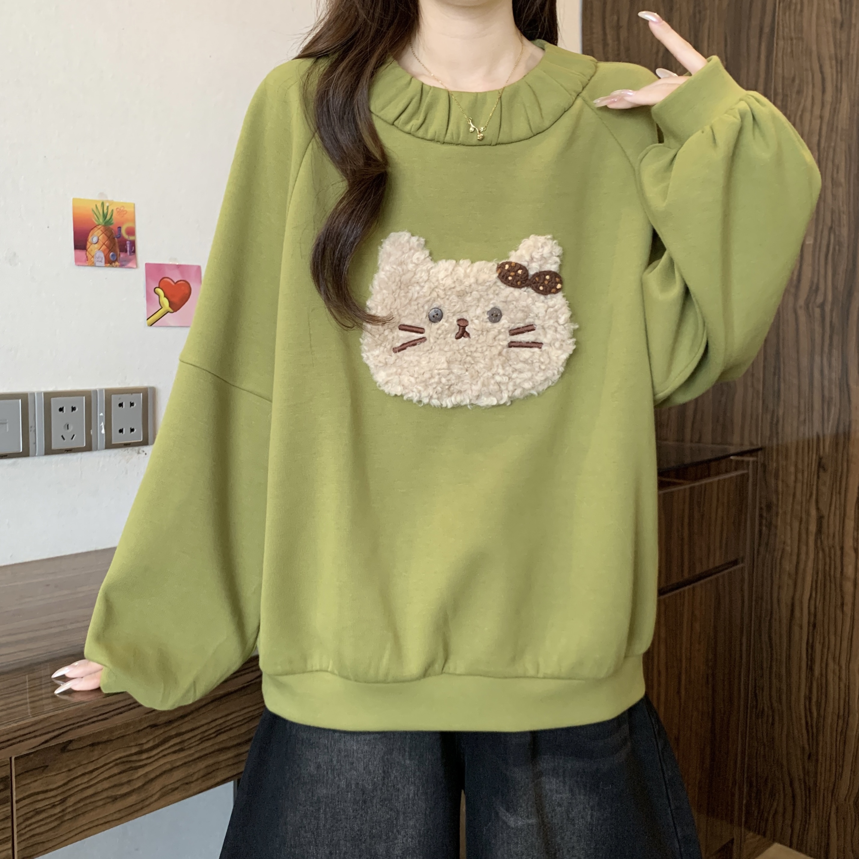 FA44503# 大码胖MM秋冬新款绿色毛绒猫咪刺绣卫衣减龄显瘦百搭上衣女 服裝批發女裝批發服飾貨源