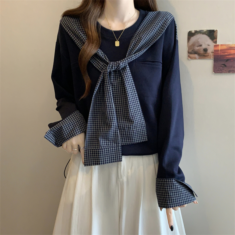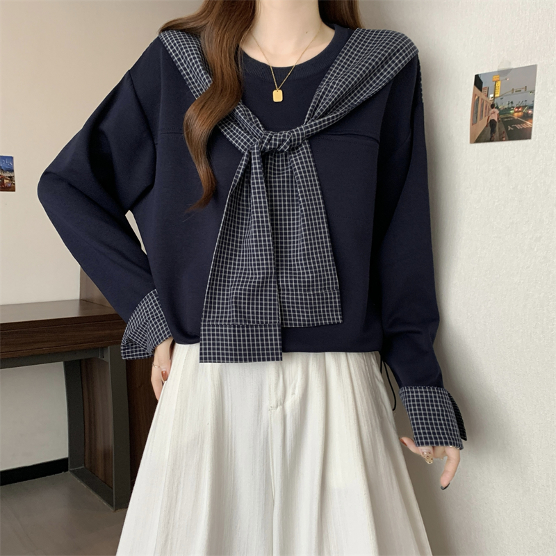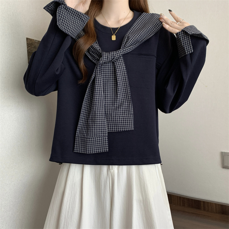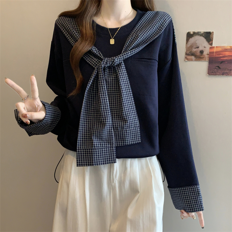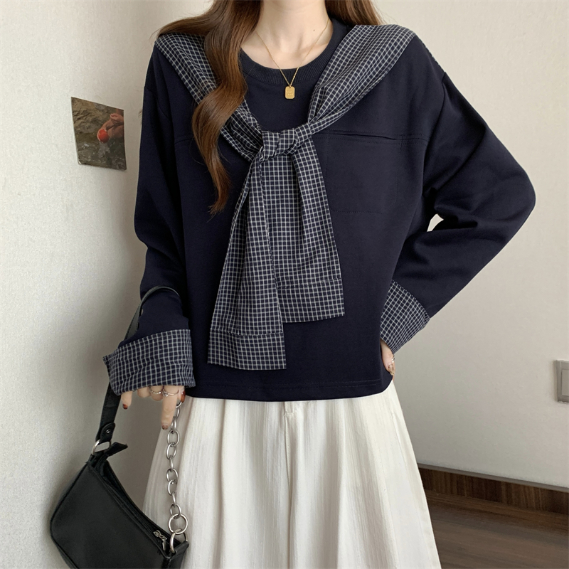 FA44506# 大码胖MM新款系带领结格子拼接假两件卫衣遮肉显瘦上衣 服裝批發女裝批發服飾貨源