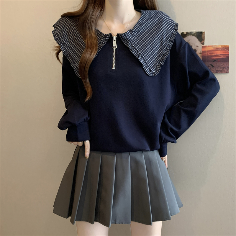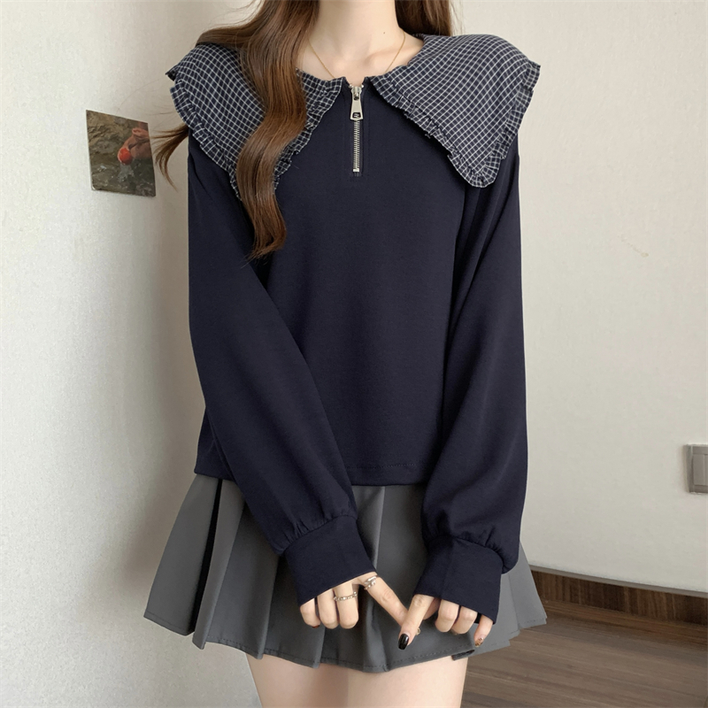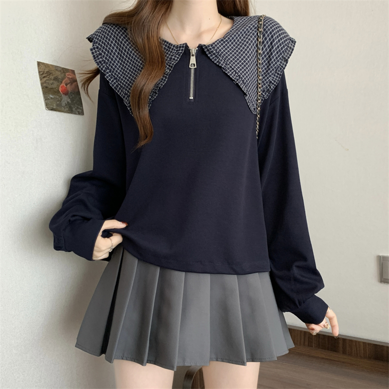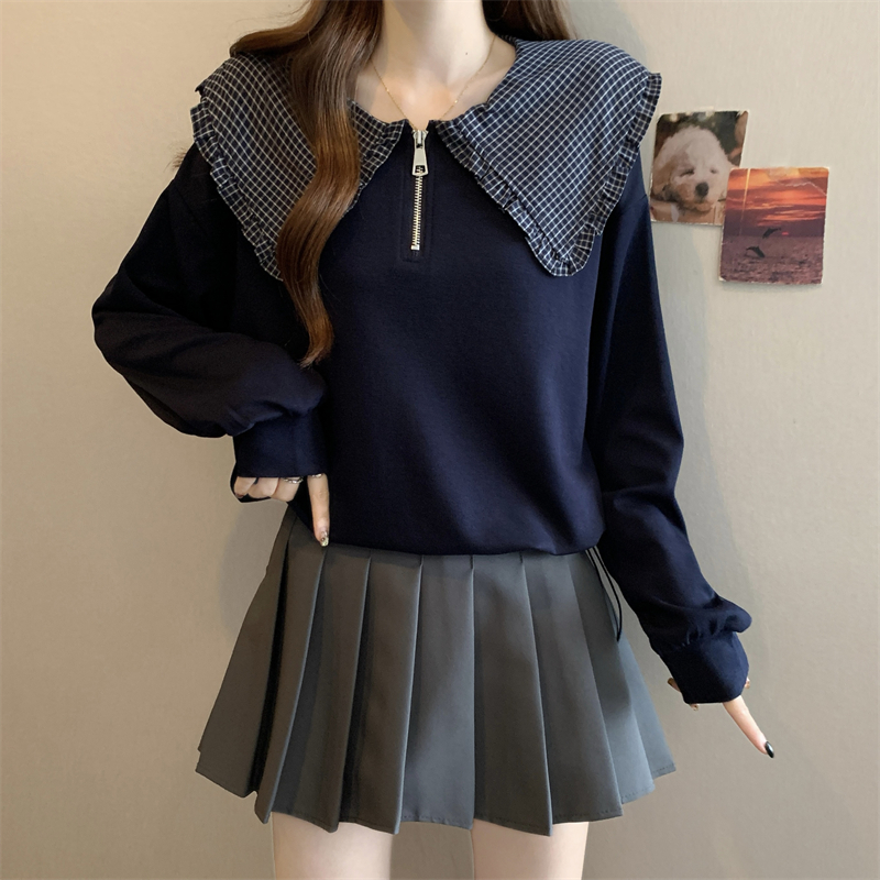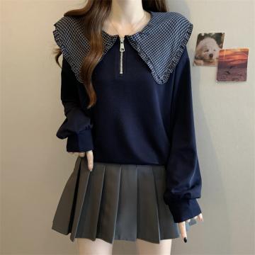 FA44508# 大码胖MM新款设计感抽绳格子拼接娃娃领卫衣遮肉显瘦上衣 服裝批發女裝批發服飾貨源