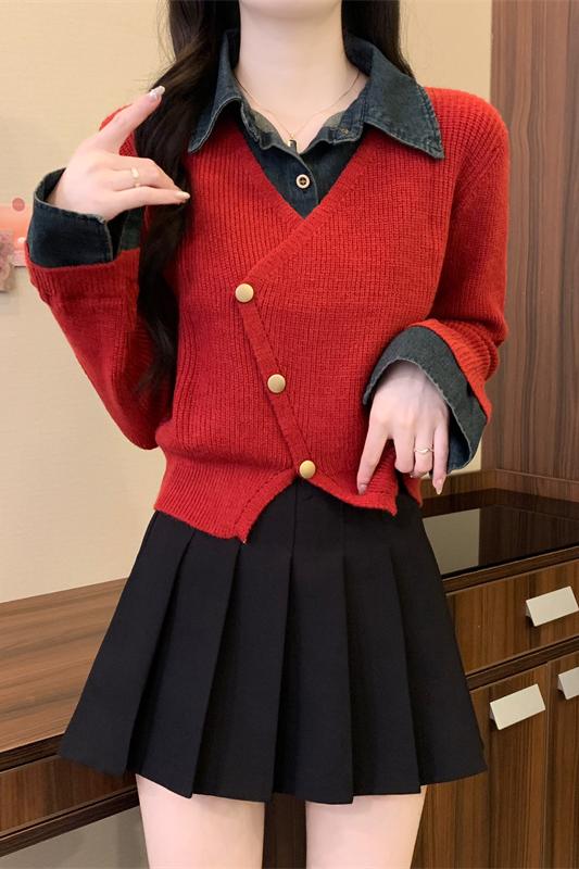 FA44557# 大码女装百搭时尚牛仔POLO领拼接毛衣冬新款假两件开衫上衣 服裝批發女裝批發服飾貨源