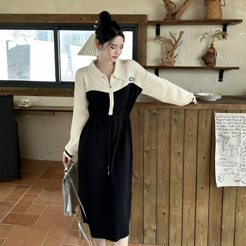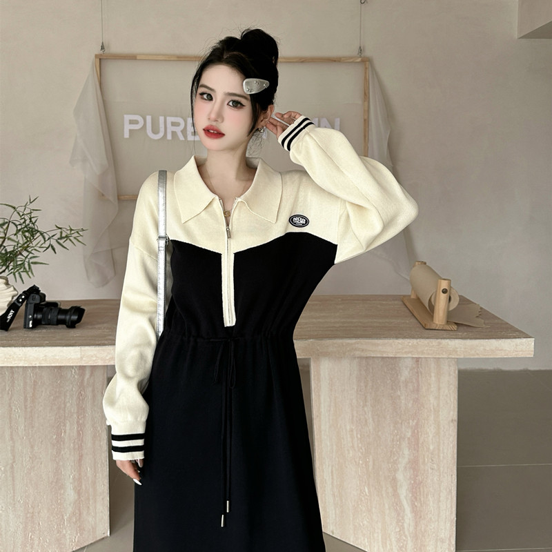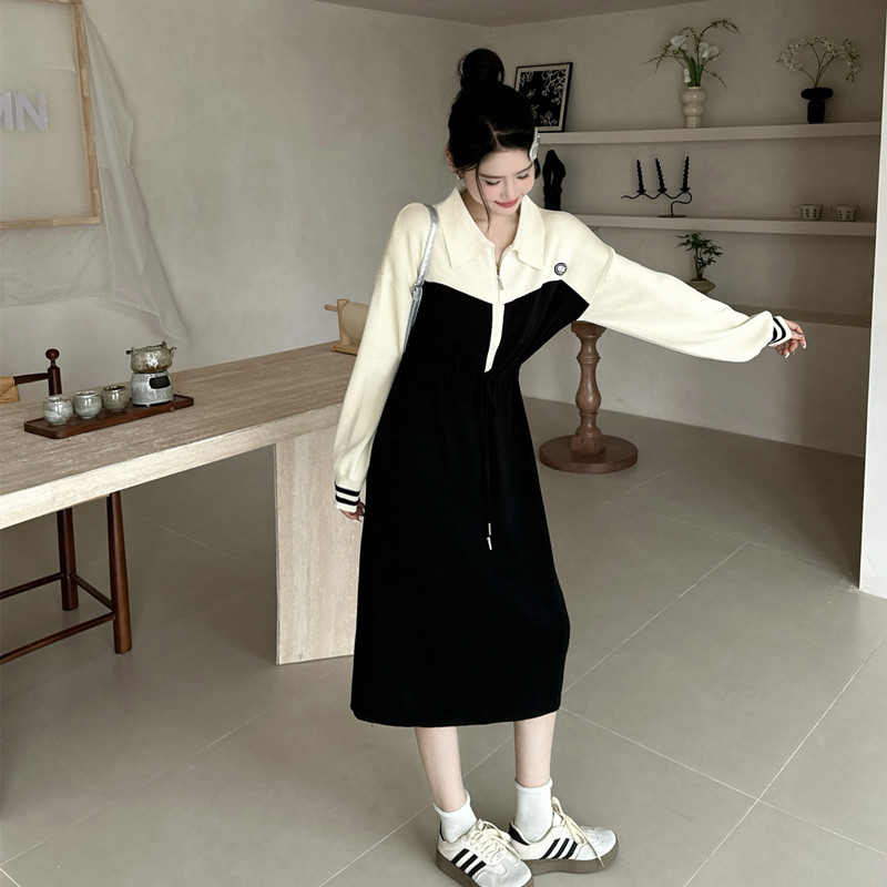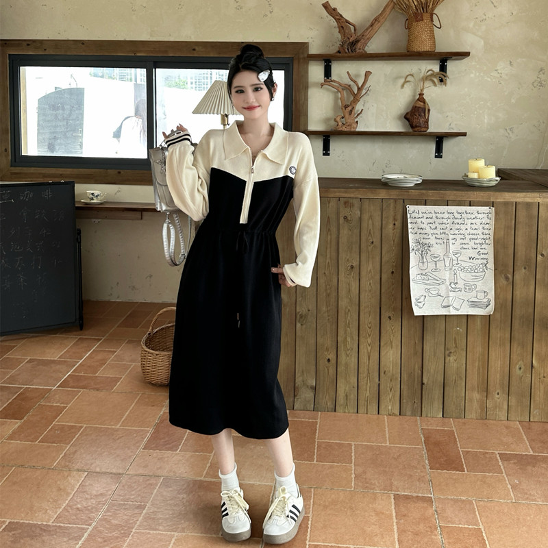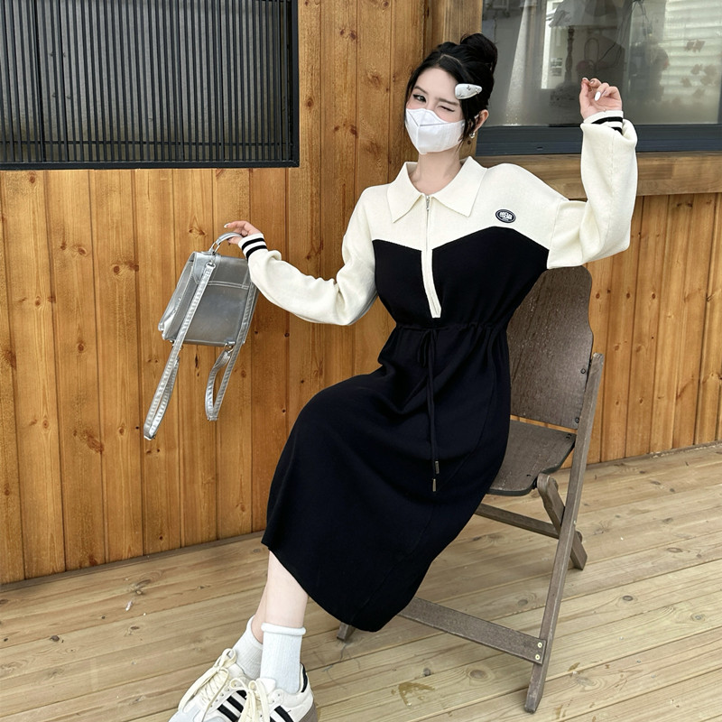 FA44567# 大码女装秋冬胖mm气质显瘦遮肚子撞色拼接polo领法式连衣裙 服裝批發女裝批發服飾貨源