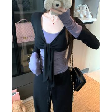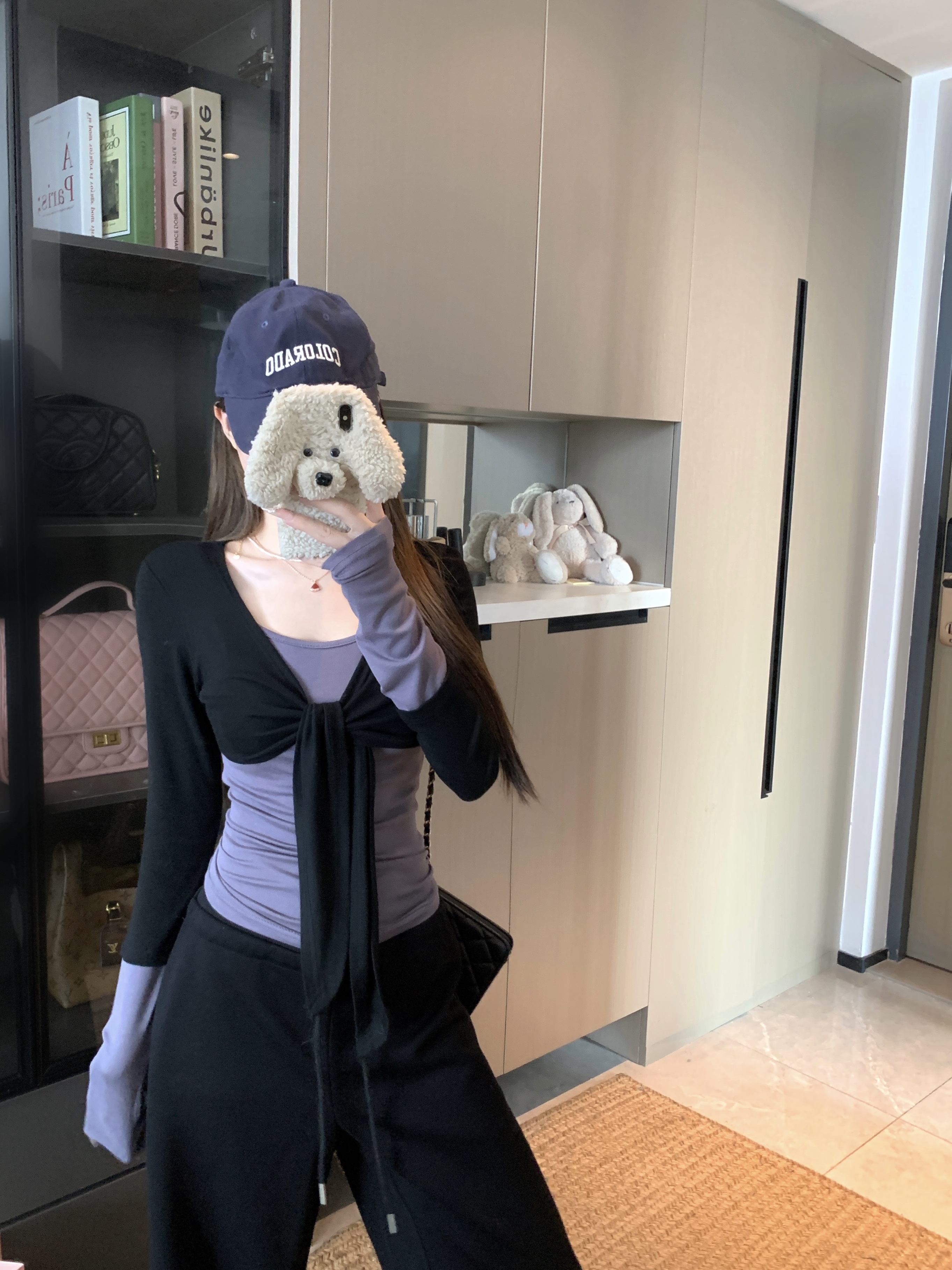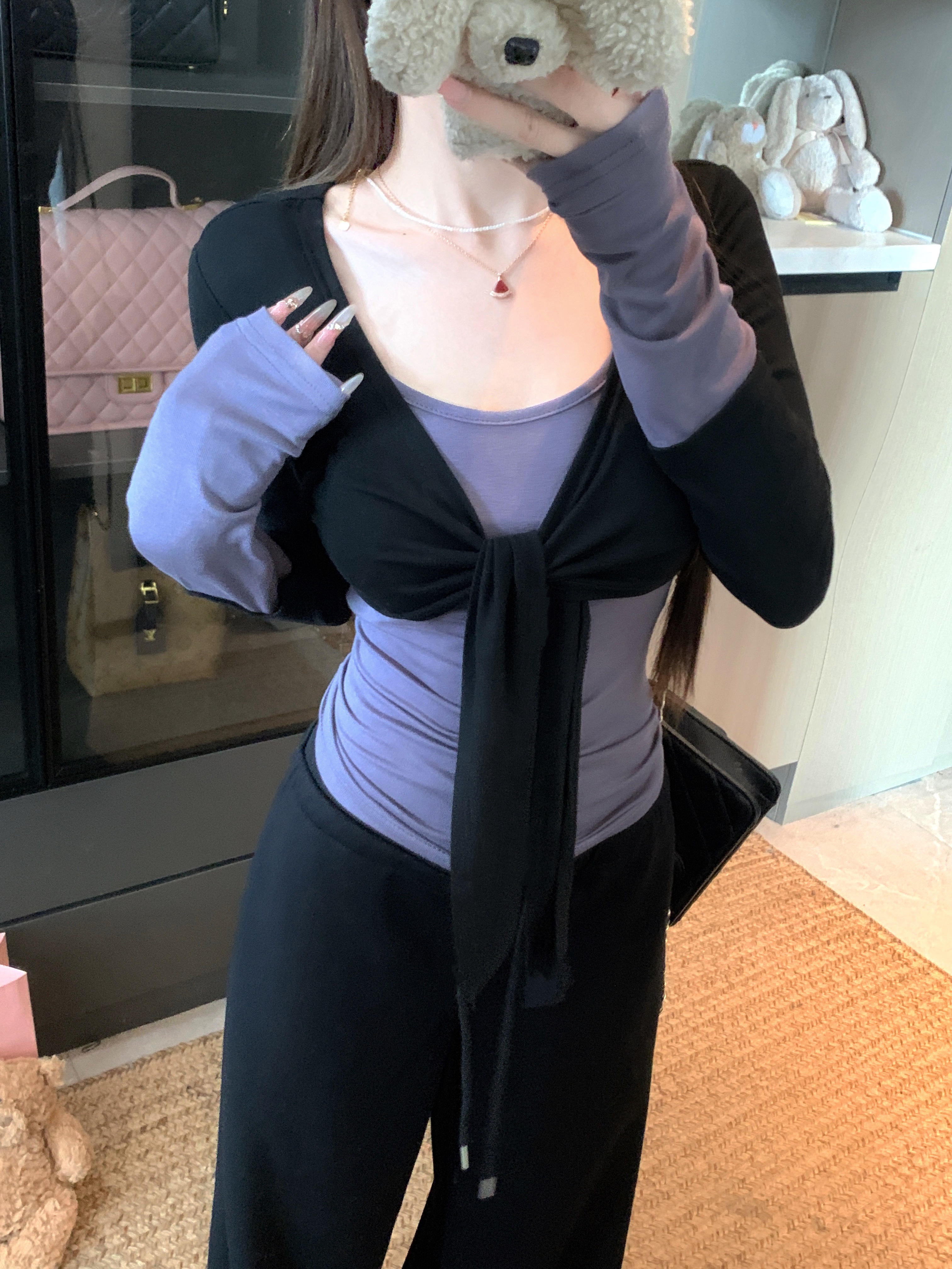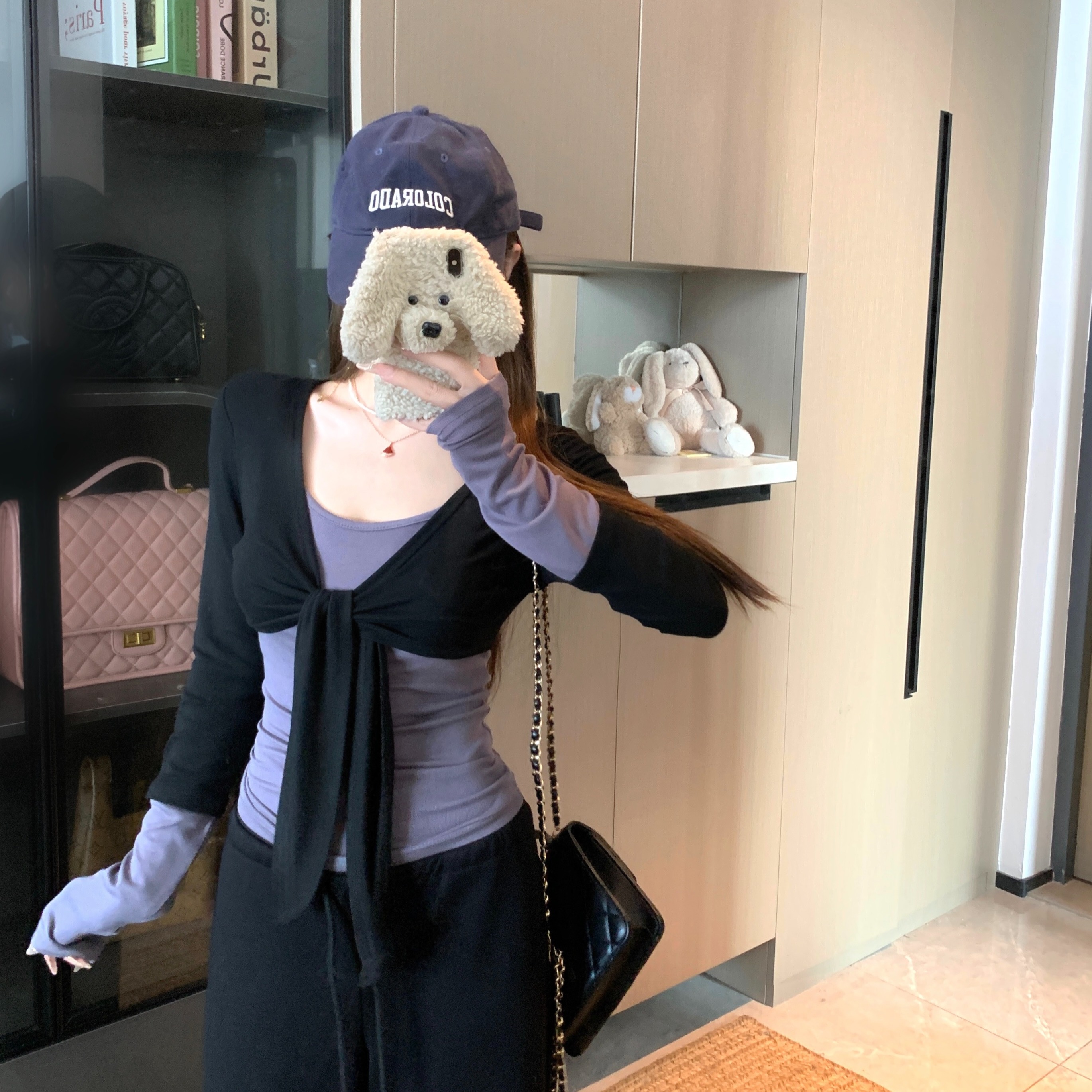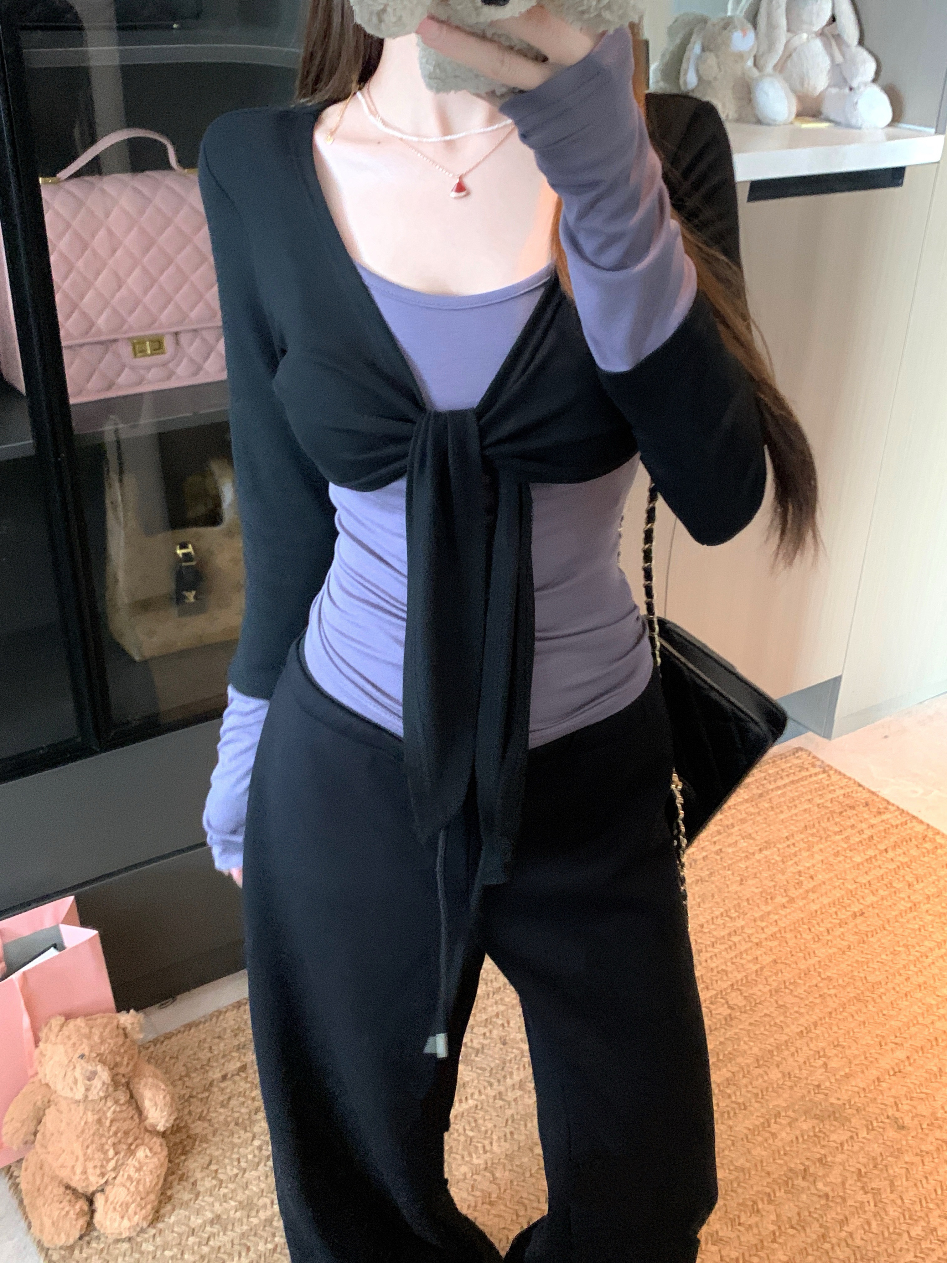 FA44598# 大码秋冬新款纯欲风撞色拼接假两件蝴蝶结绑带修身显瘦上衣 服裝批發女裝批發服飾貨源