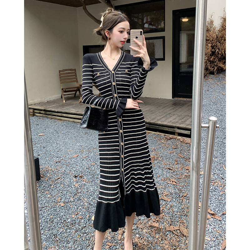 FA44649# 秋冬新款小香风v领条纹针织连衣裙长裙木耳边显瘦气质高级感 服裝批發女裝批發服飾貨源