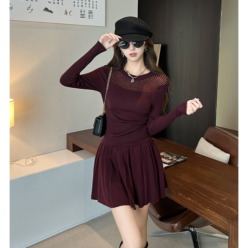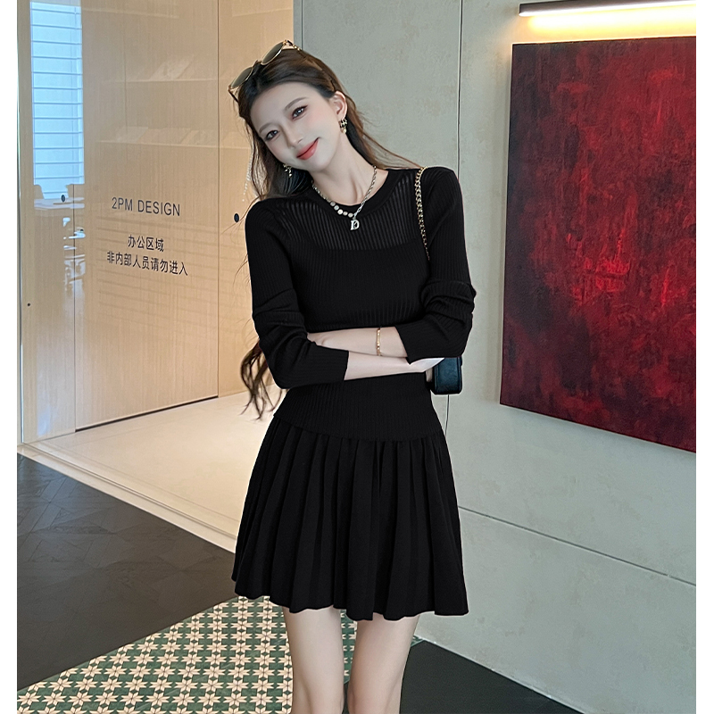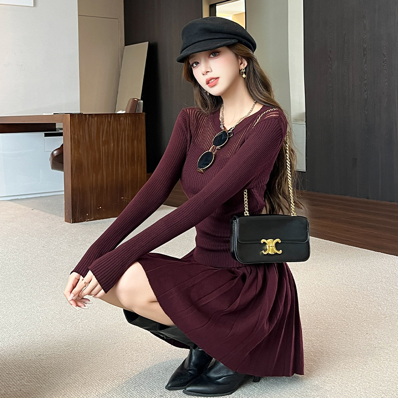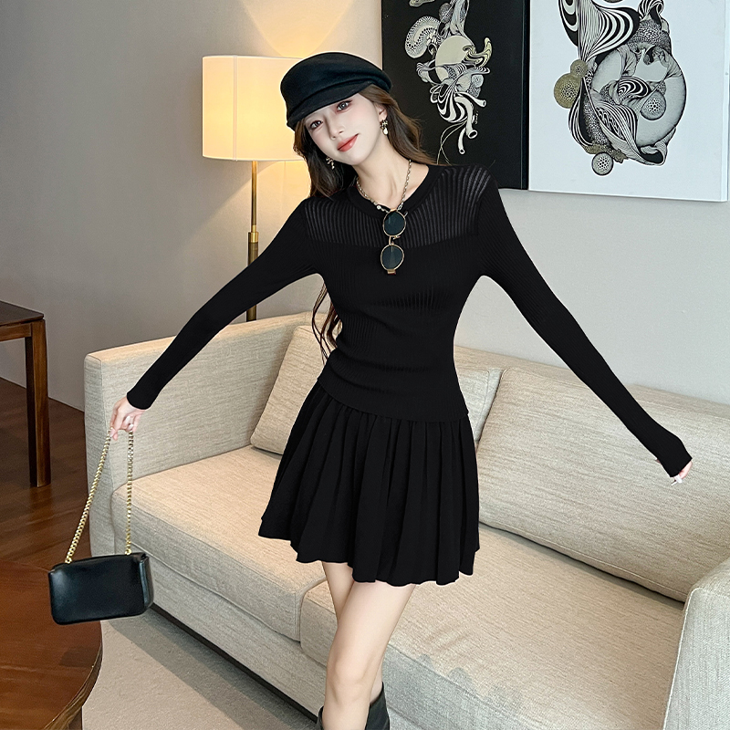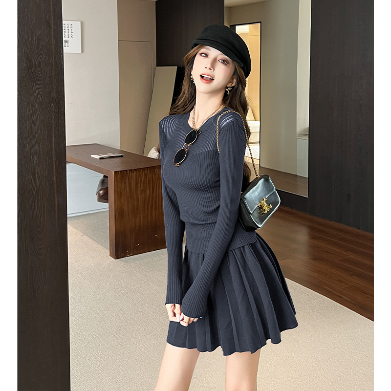 FA44651# 秋冬新款韩版纯色简约缕空长袖针织衫上衣百褶短裙时尚两件套 服裝批發女裝批發服飾貨源