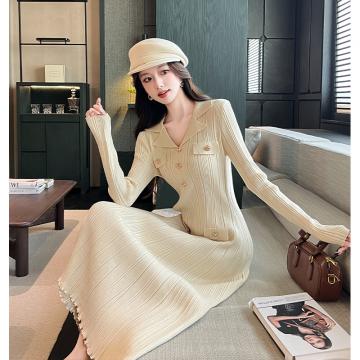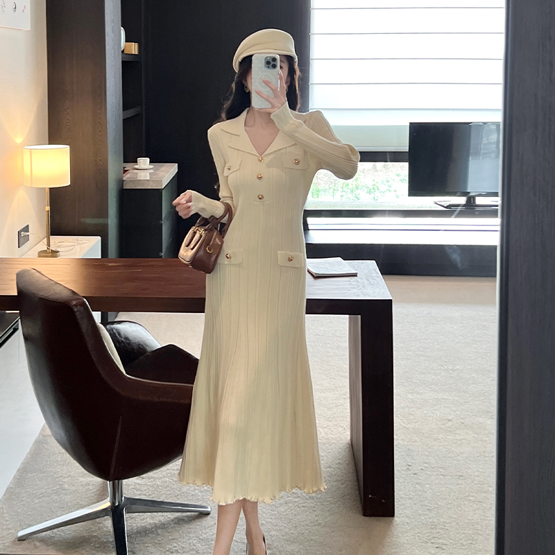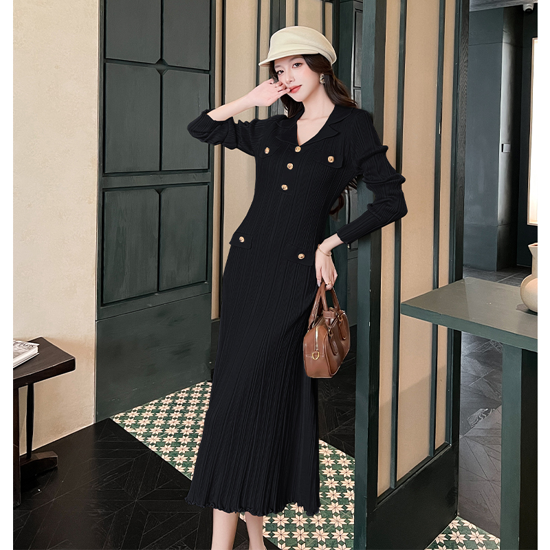 FA44652# 秋冬新款法式温柔风优雅气质修身显瘦长袖针织连衣裙过膝长裙 服裝批發女裝批發服飾貨源