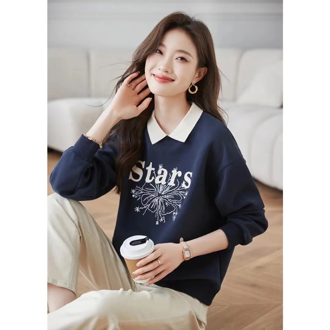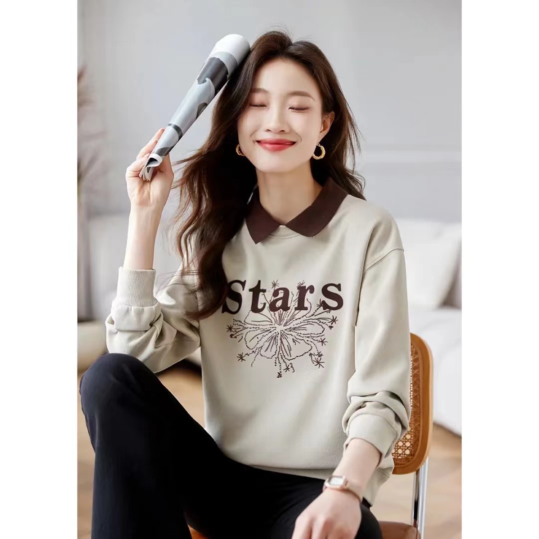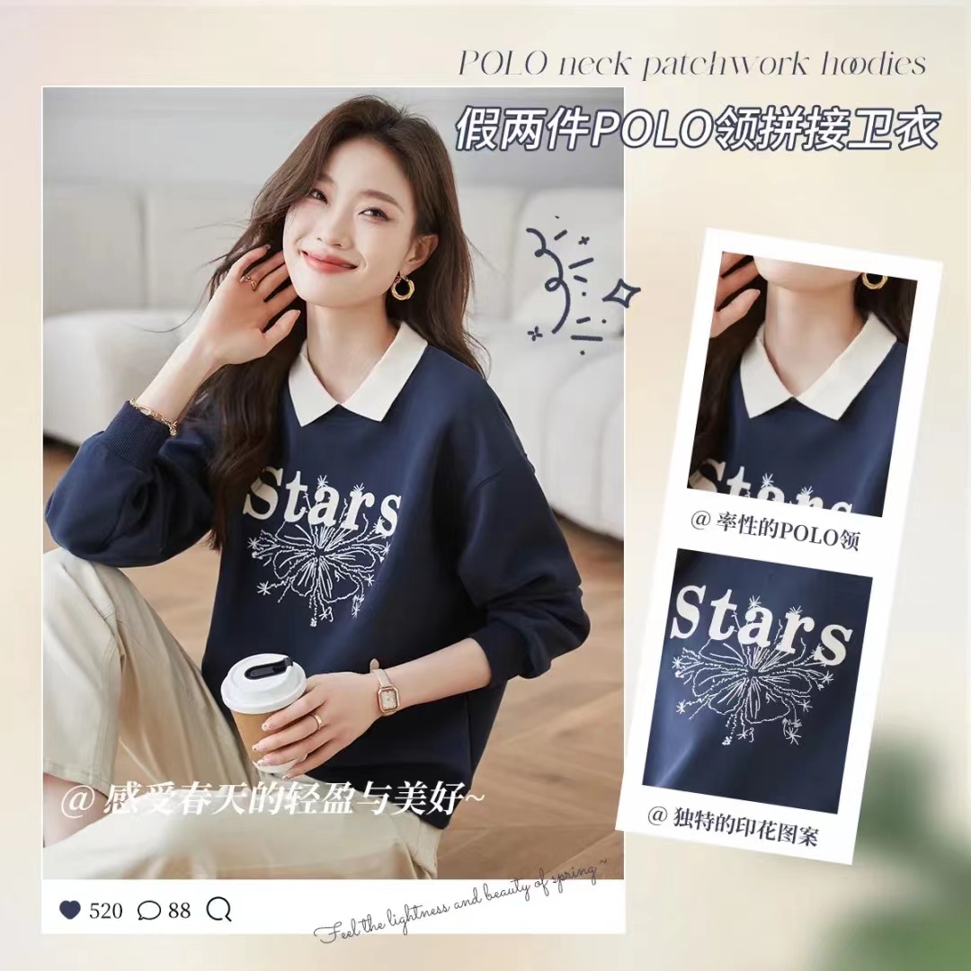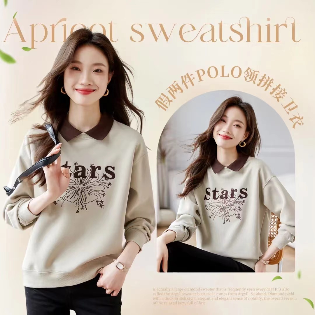 FA44679# 免搭配假两件春装女式新款翻领字母印花长袖打底内搭卫衣上衣 服裝批發女裝批發服飾貨源