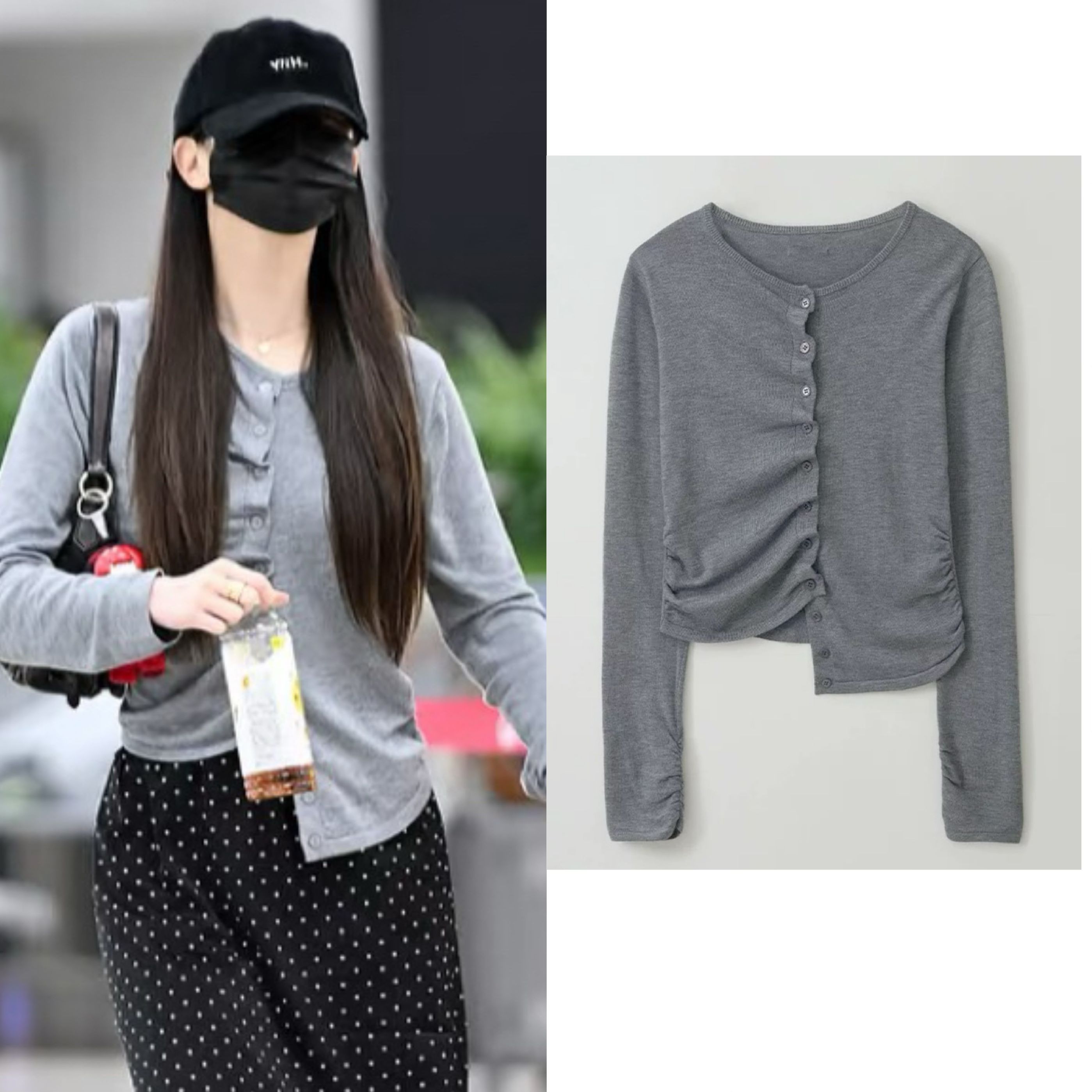 FA44744# 张元英同款秋季新款韩版灰色不对称褶皱长袖针织开衫上衣女 服裝批發女裝批發服飾貨源