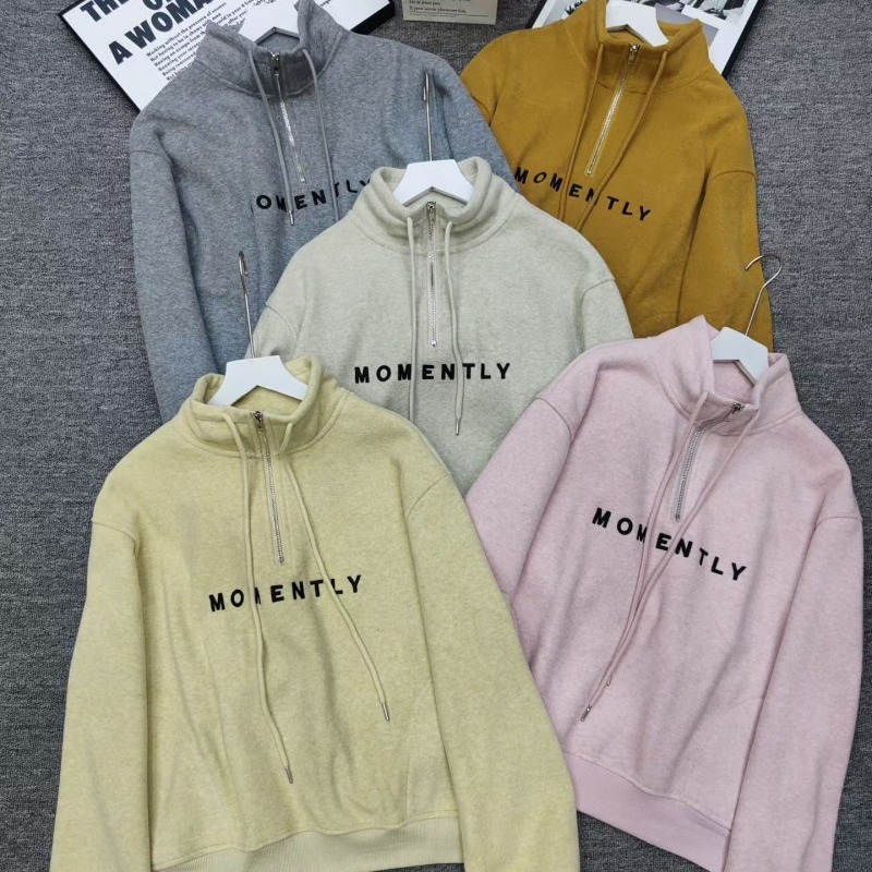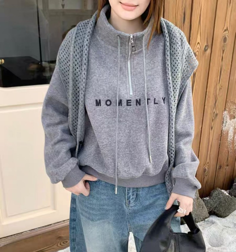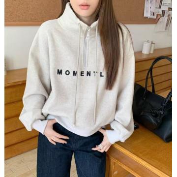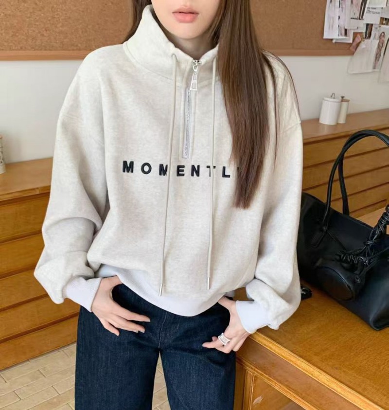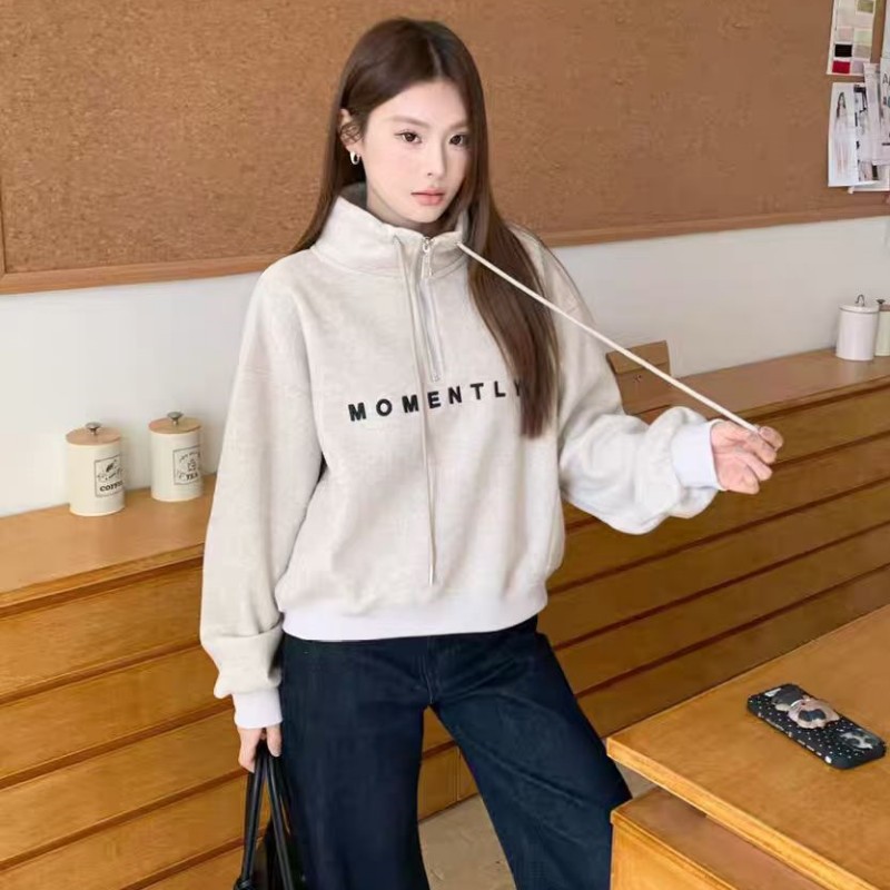 FA44815# 高品质加绒韩版半拉链立领字母刺绣卫衣女冬季减龄学院慵懒上衣 服裝批發女裝批發服飾貨源
