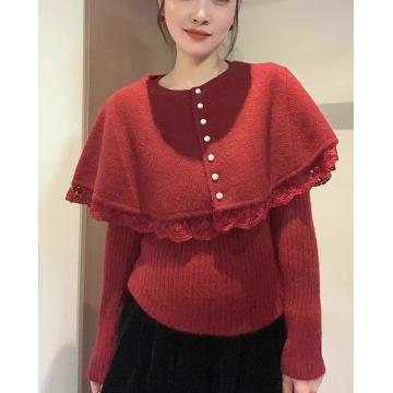 FA44886# 法式复古甜美蕾丝花边拼接斗篷披肩针织打底衫毛衣两件套装女秋冬 服裝批發女裝批發服飾貨源