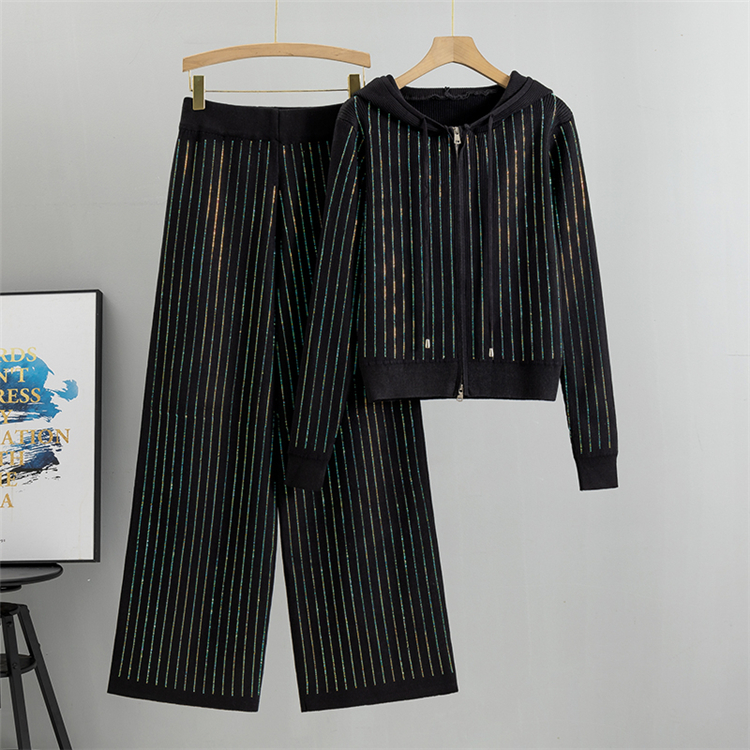 FA44893# 欧洲站女装阔腿裤连帽针织开衫两件套女春秋时尚宽松休闲烫钻套装 服裝批發女裝批發服飾貨源