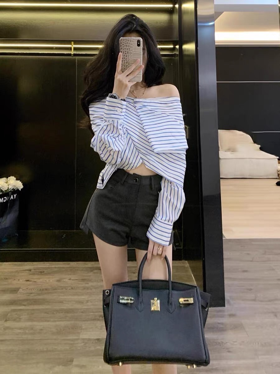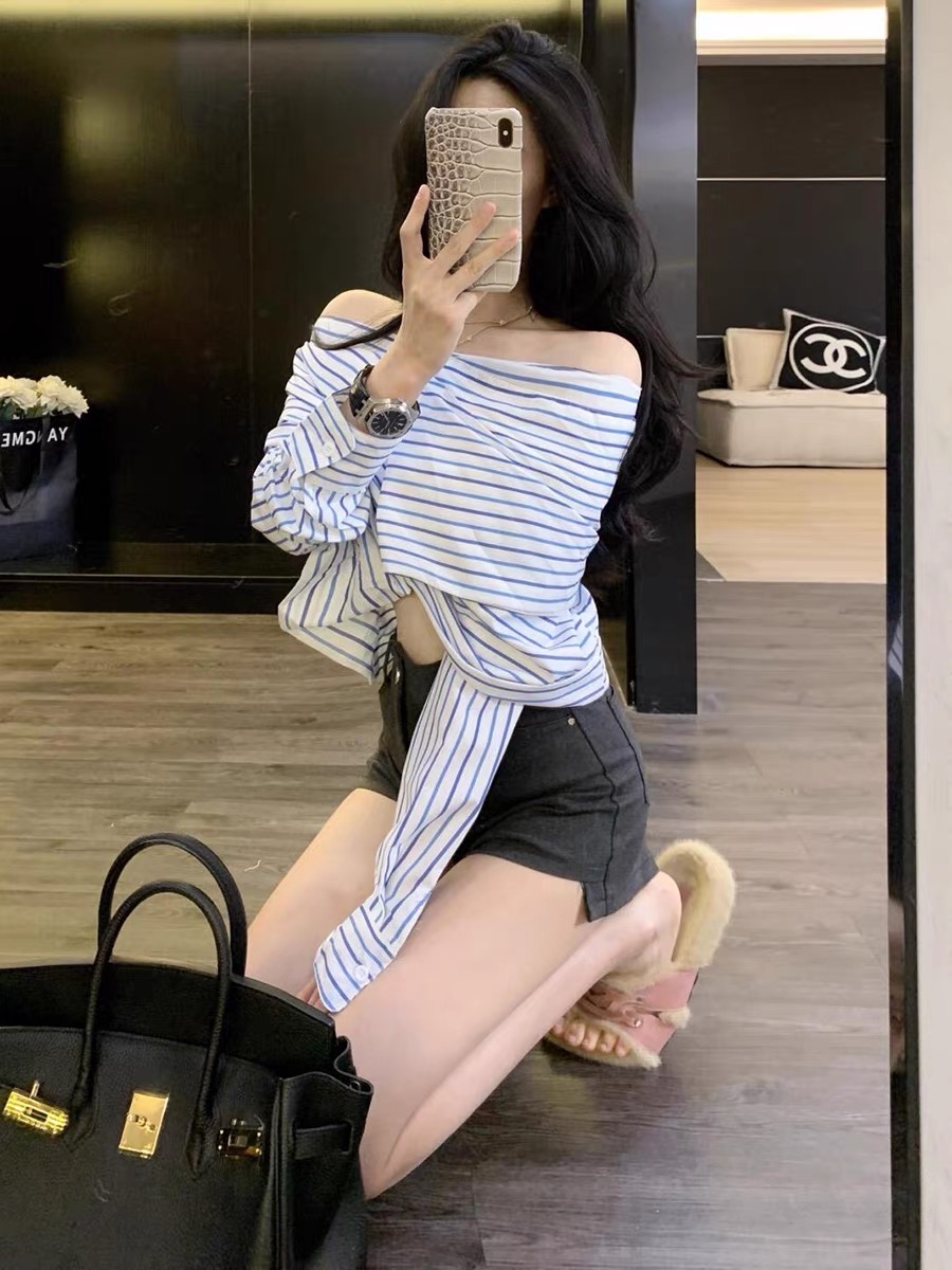 FA44966# 秋季新款韩版设计感一字领条纹长袖短款衬衫上衣短裤套装女 服裝批發女裝批發服飾貨源
