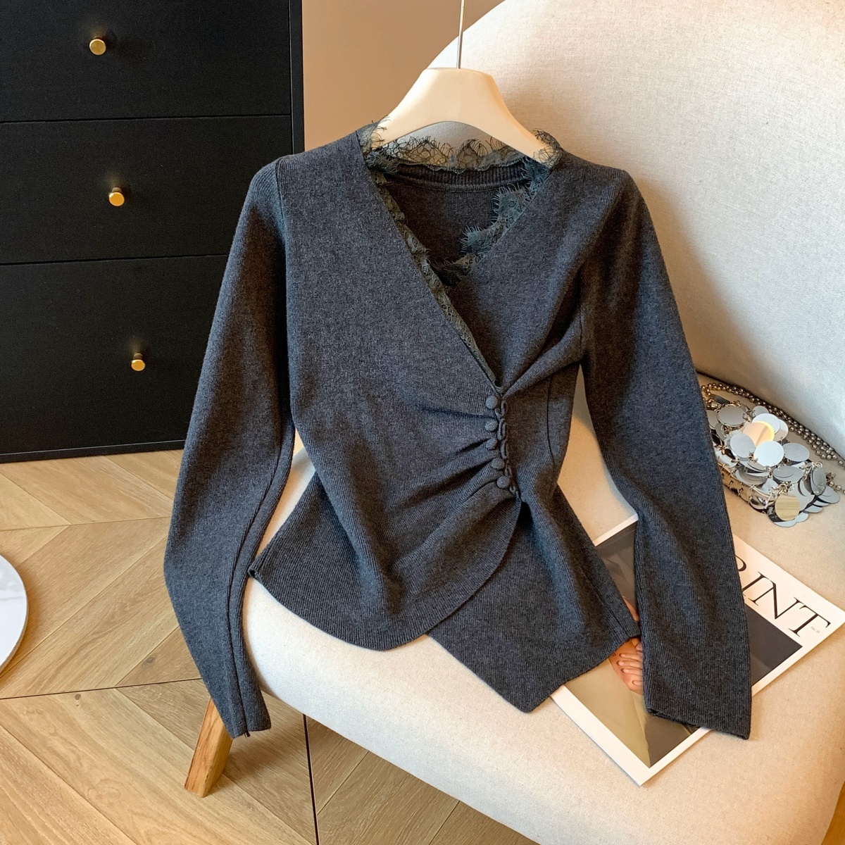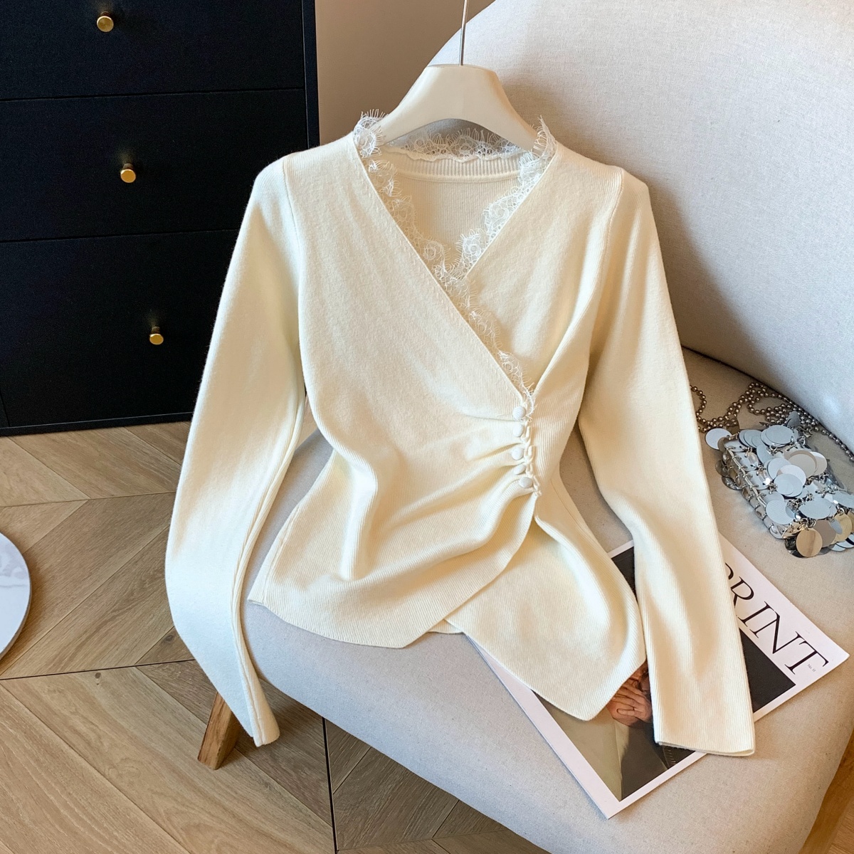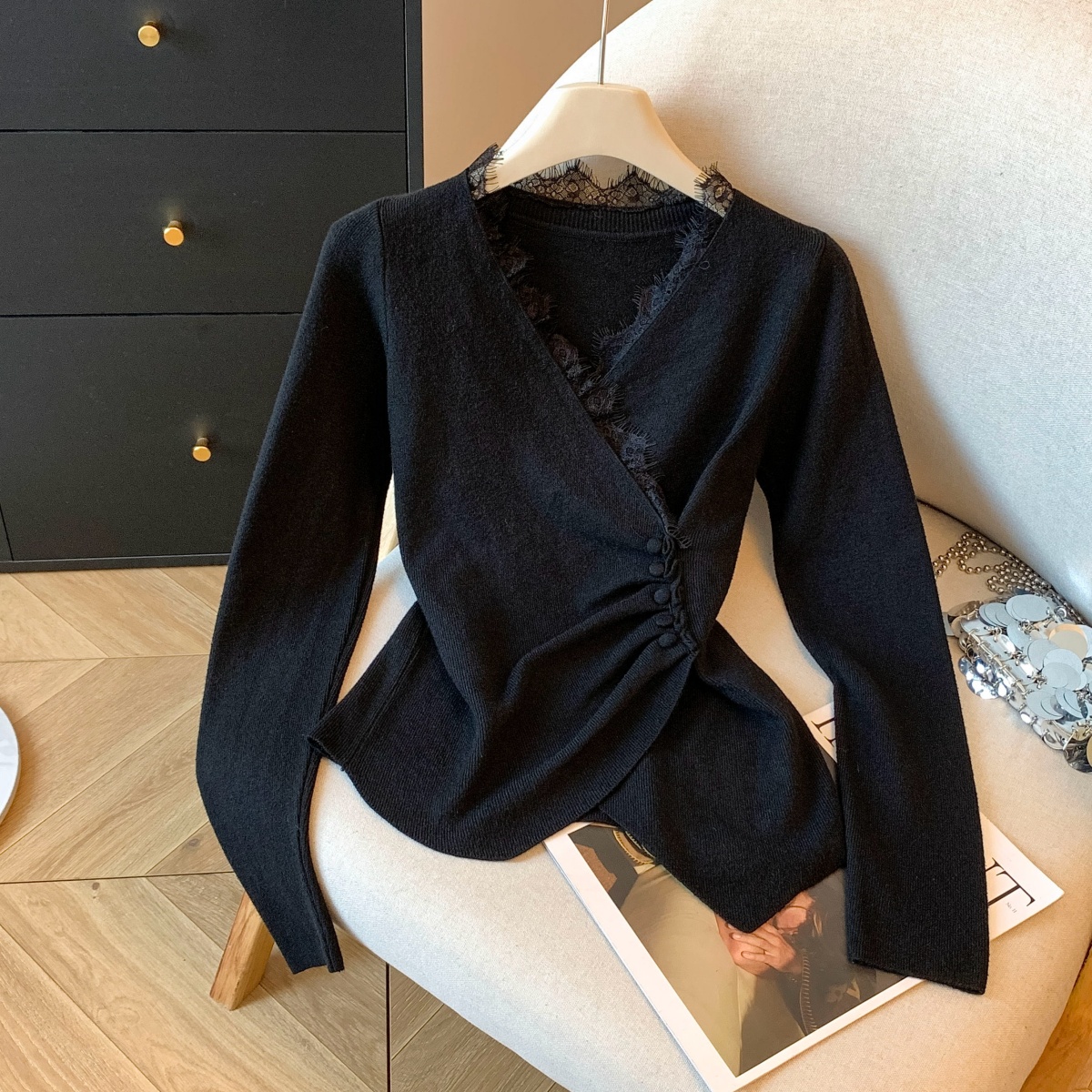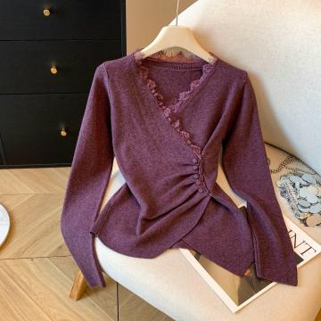 FA45067# 韩版设计感小众不规则蕾丝花边收腰褶皱交叉V领长打底衫上衣 服裝批發女裝批發服飾貨源