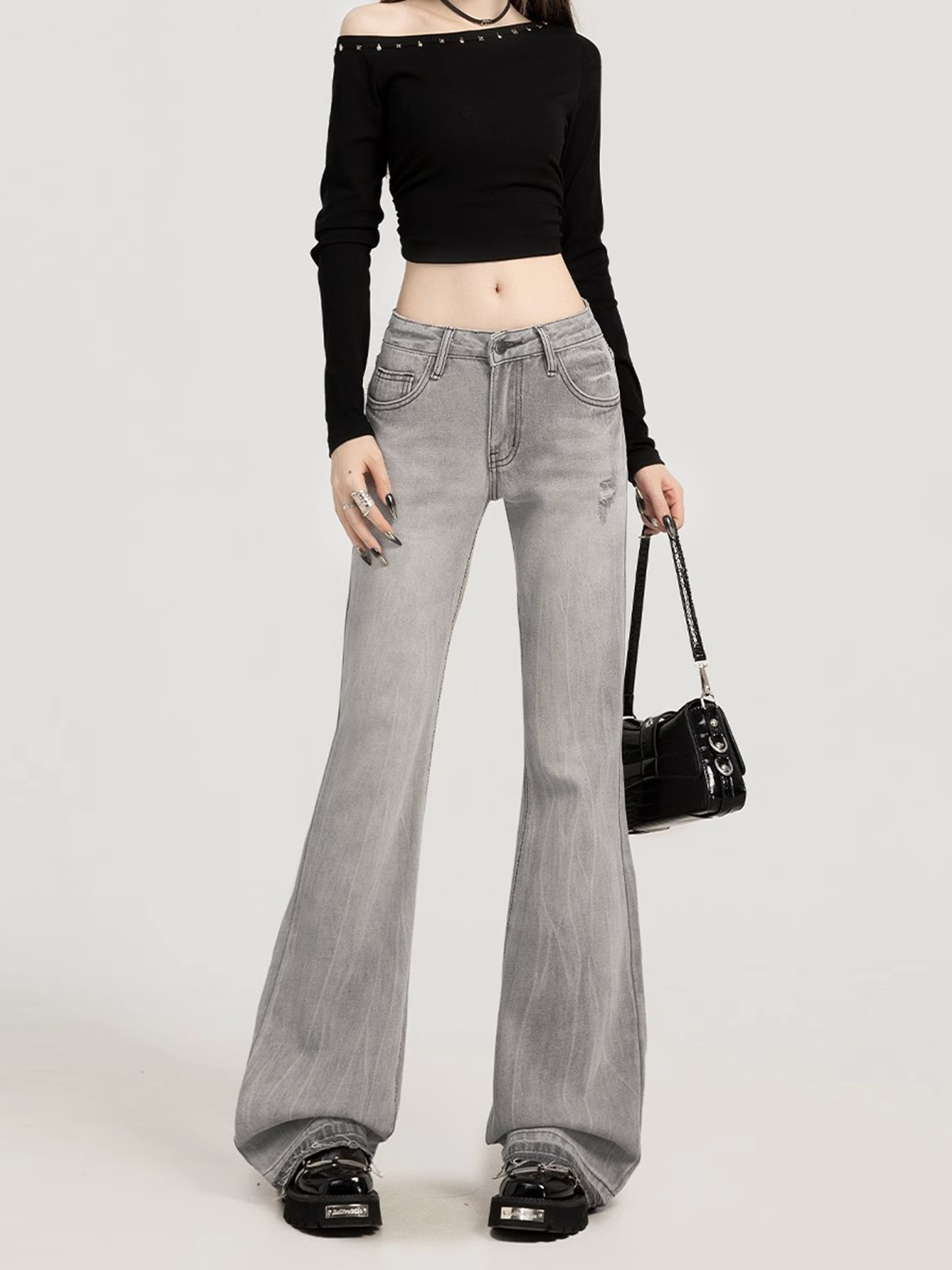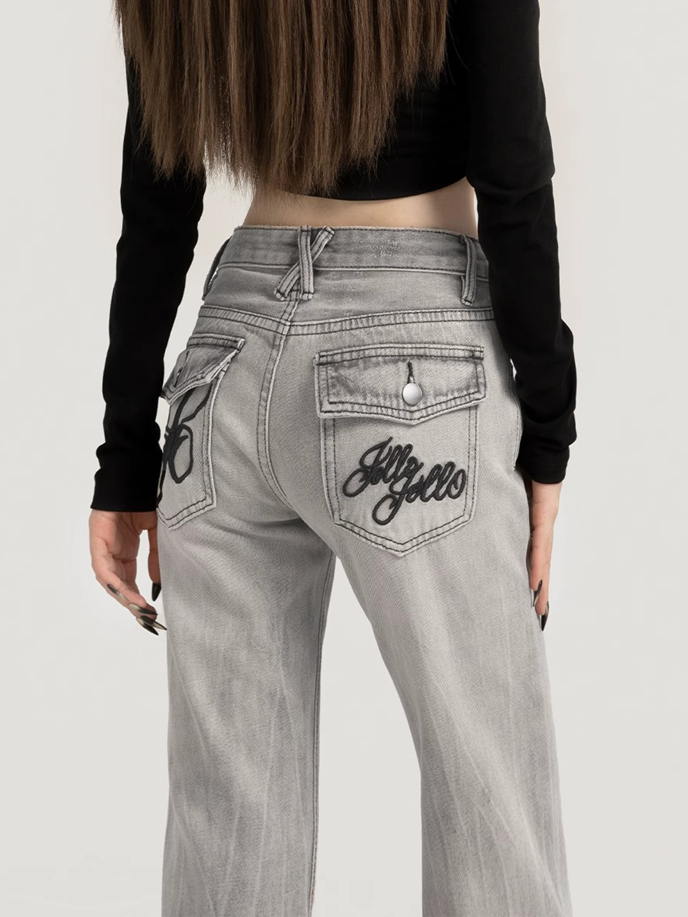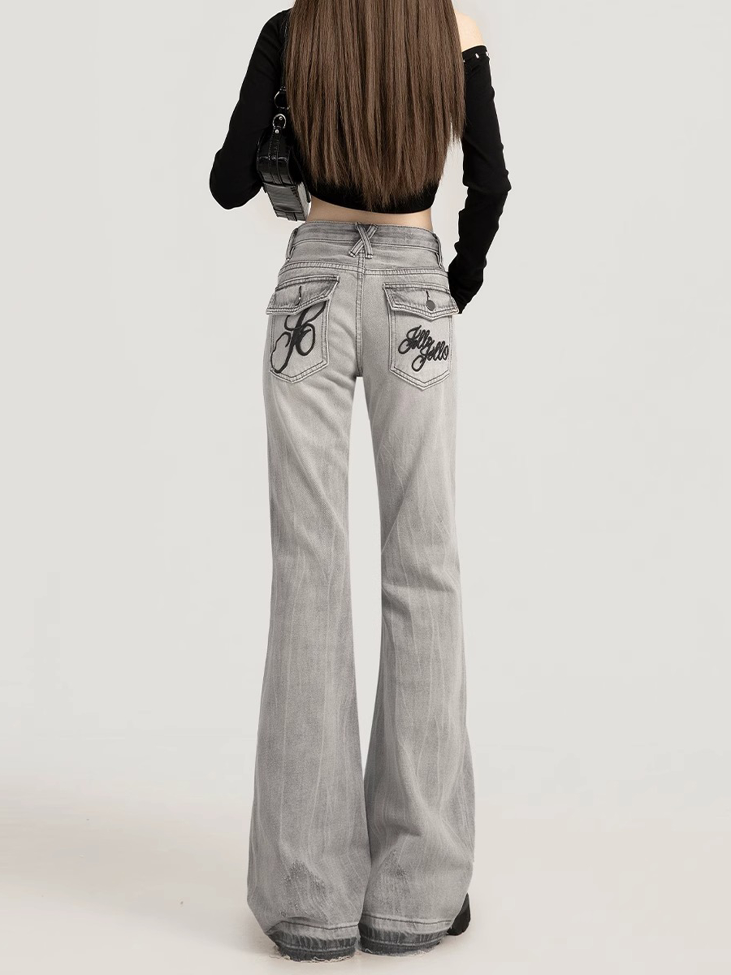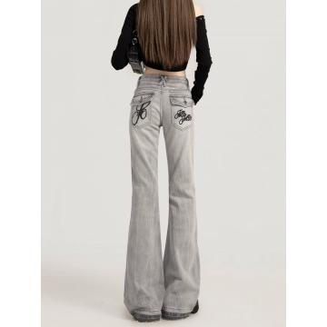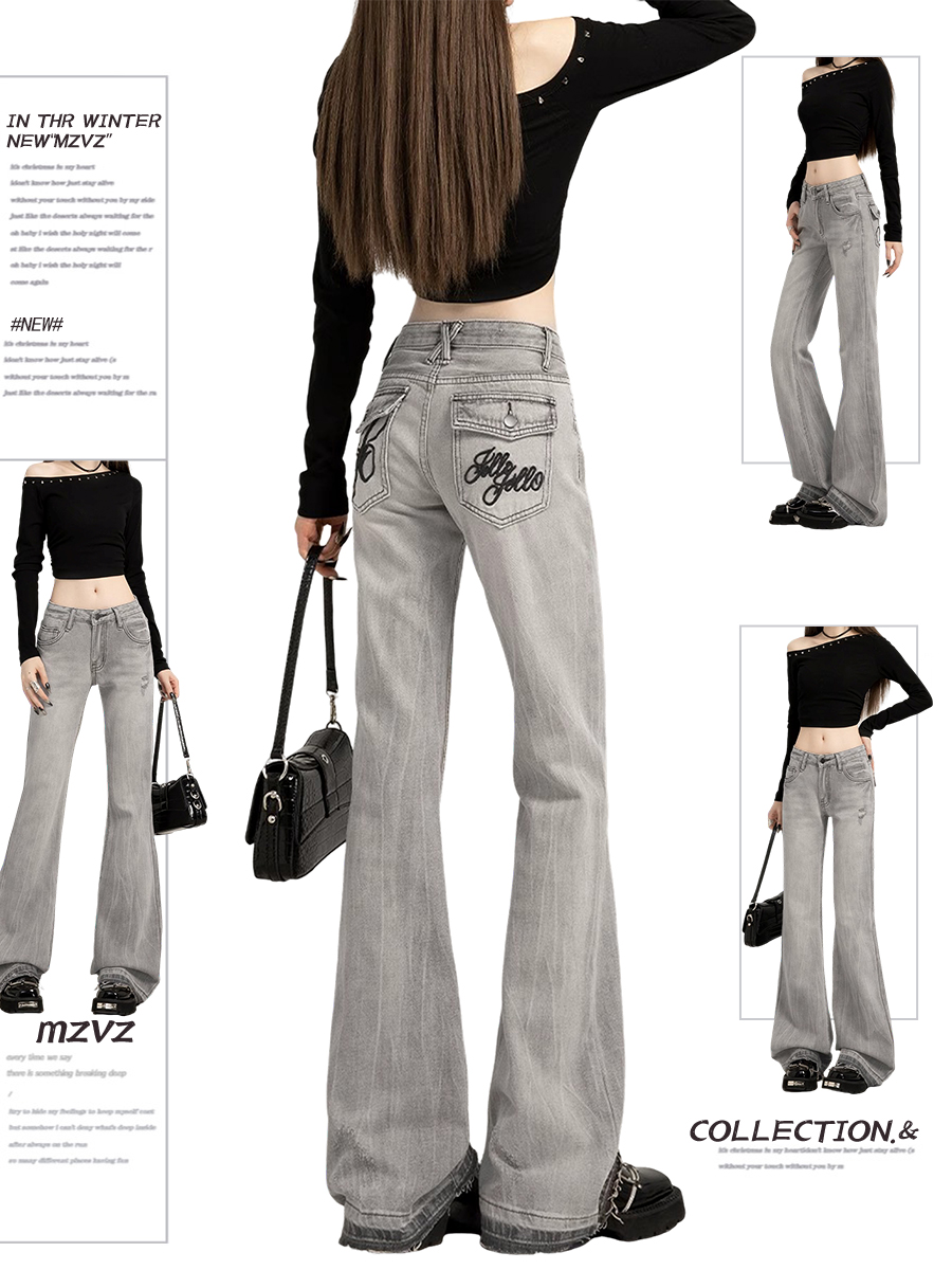 FA45574# 美式烟灰色刺绣微喇牛仔裤女秋季新款不贴腿低腰毛边喇叭裤 服裝批發女裝批發服飾貨源