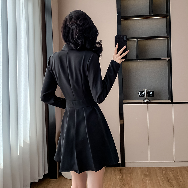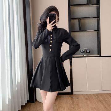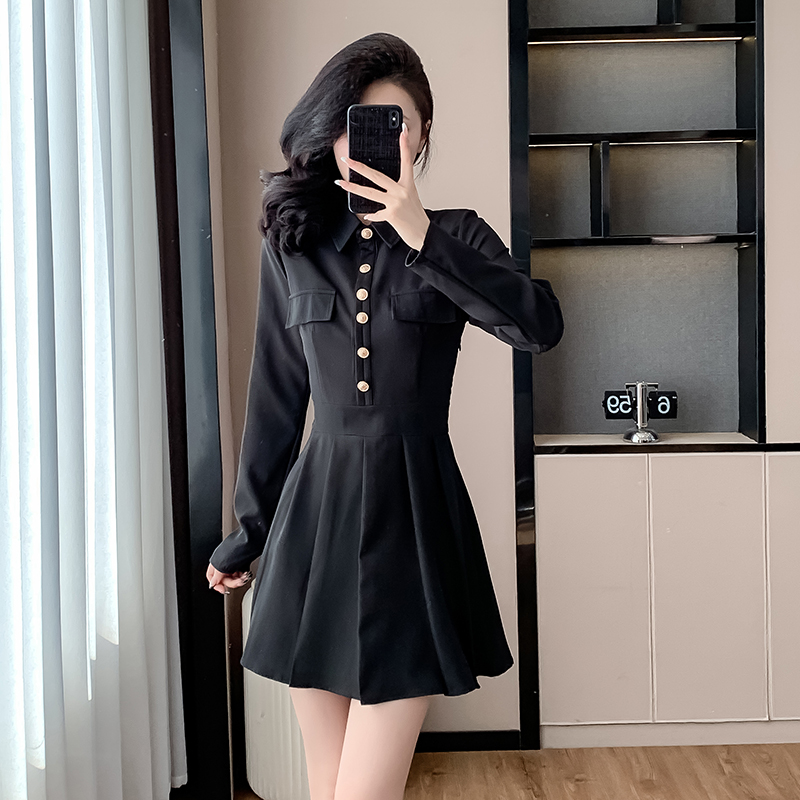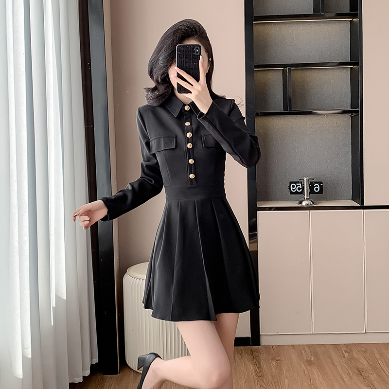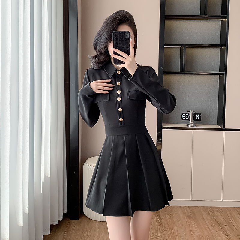 FA45745# 春秋装新款收腰显瘦气质法式设计单排扣Polo领百褶连衣裙 服裝批發女裝批發服飾貨源