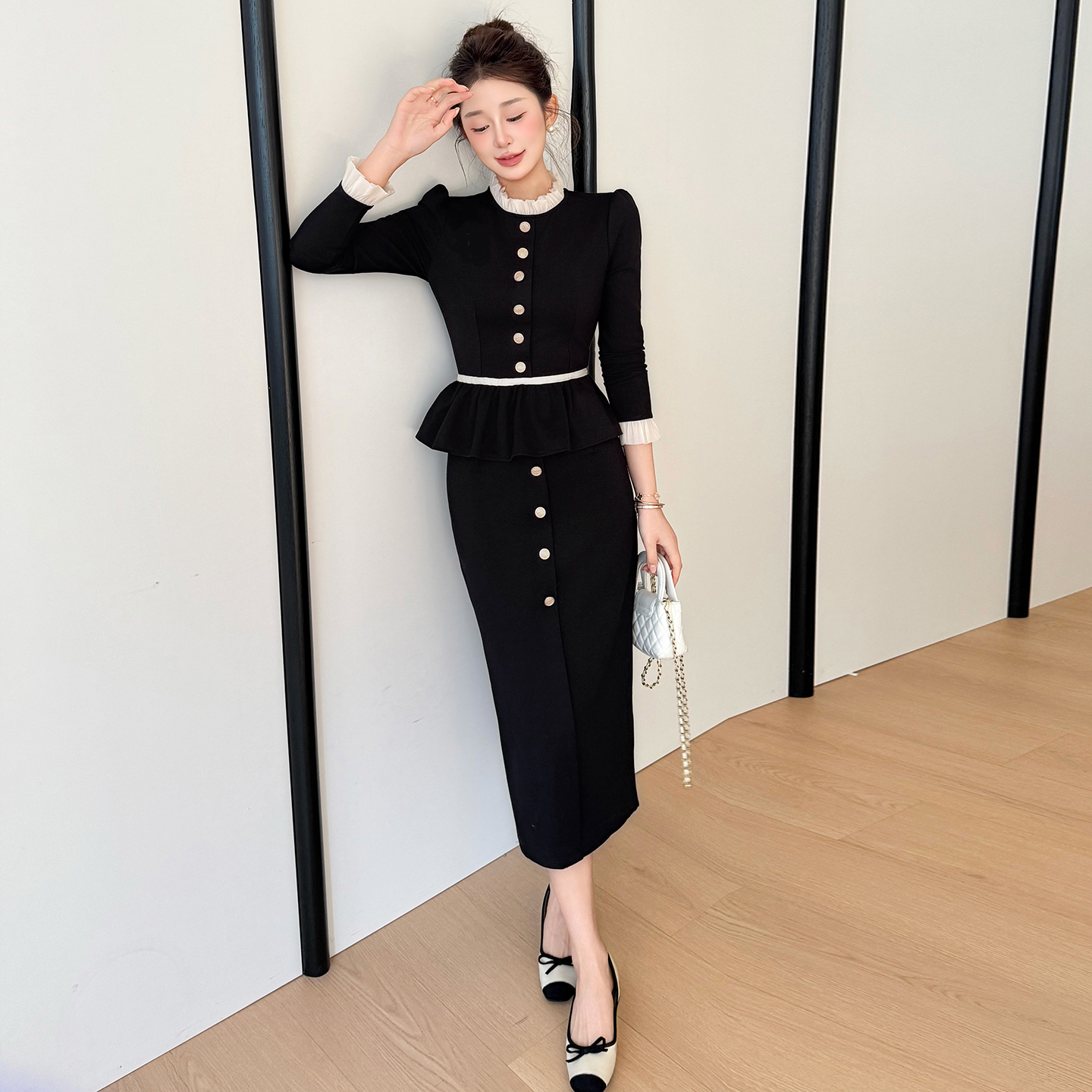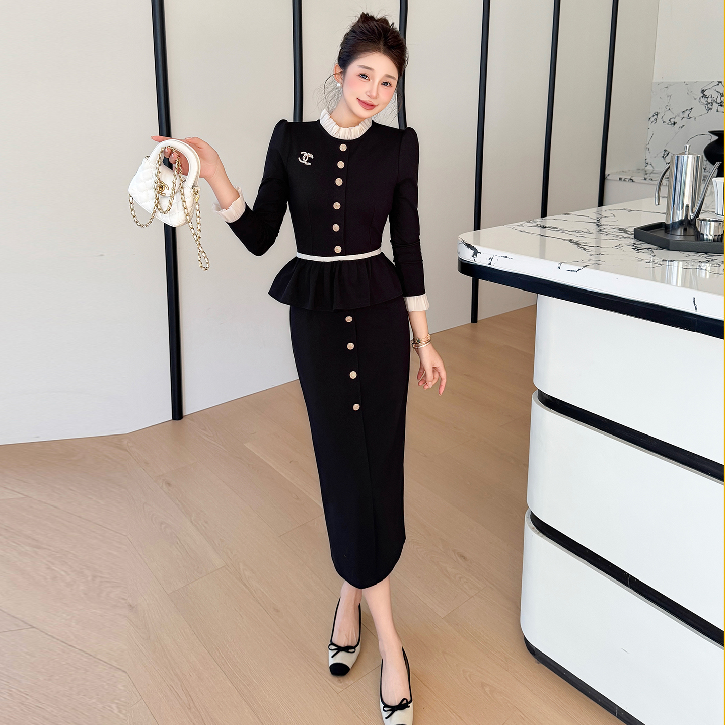 FA46634# 秋冬名媛风拼接荷叶边假两件显瘦胸花赫本风大码连衣裙