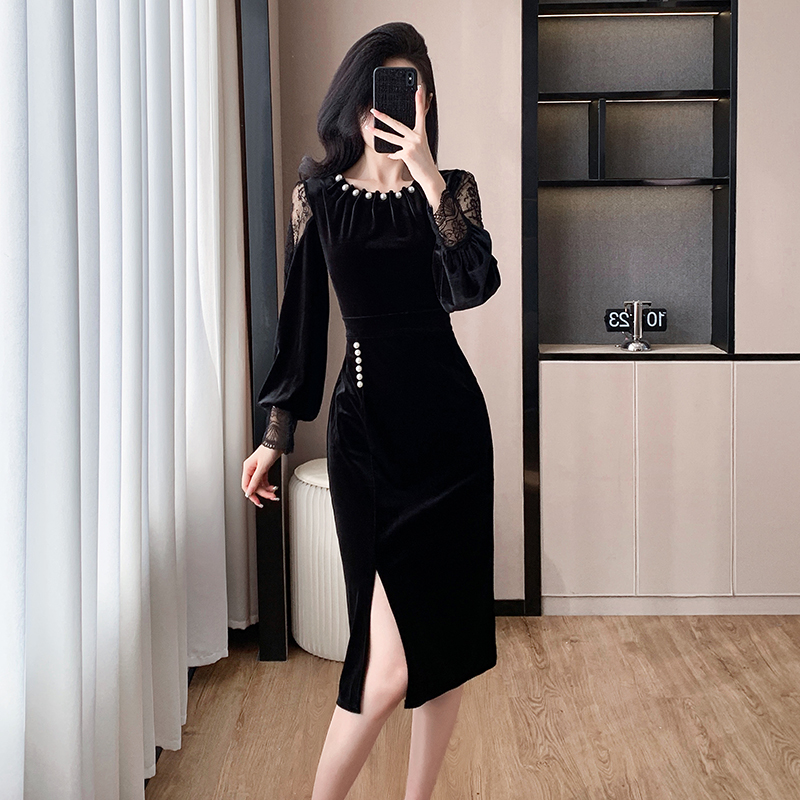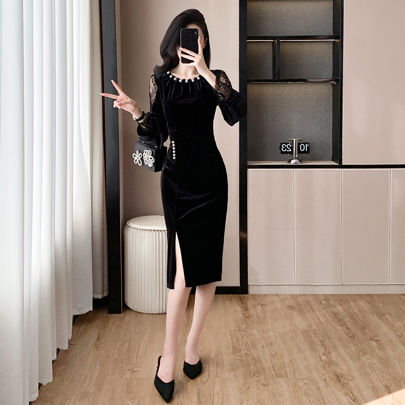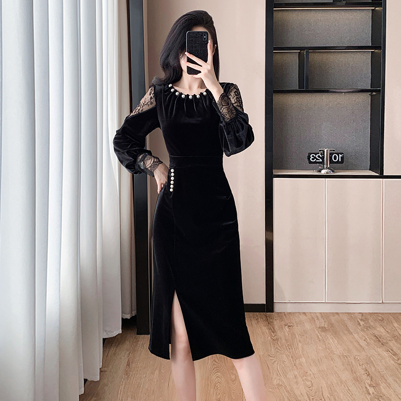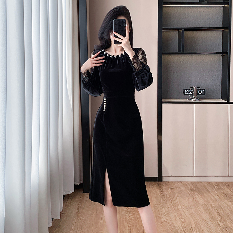 FA46638# 秋冬新款时尚蕾丝拼接珍珠手工轻奢设计感开叉连衣裙