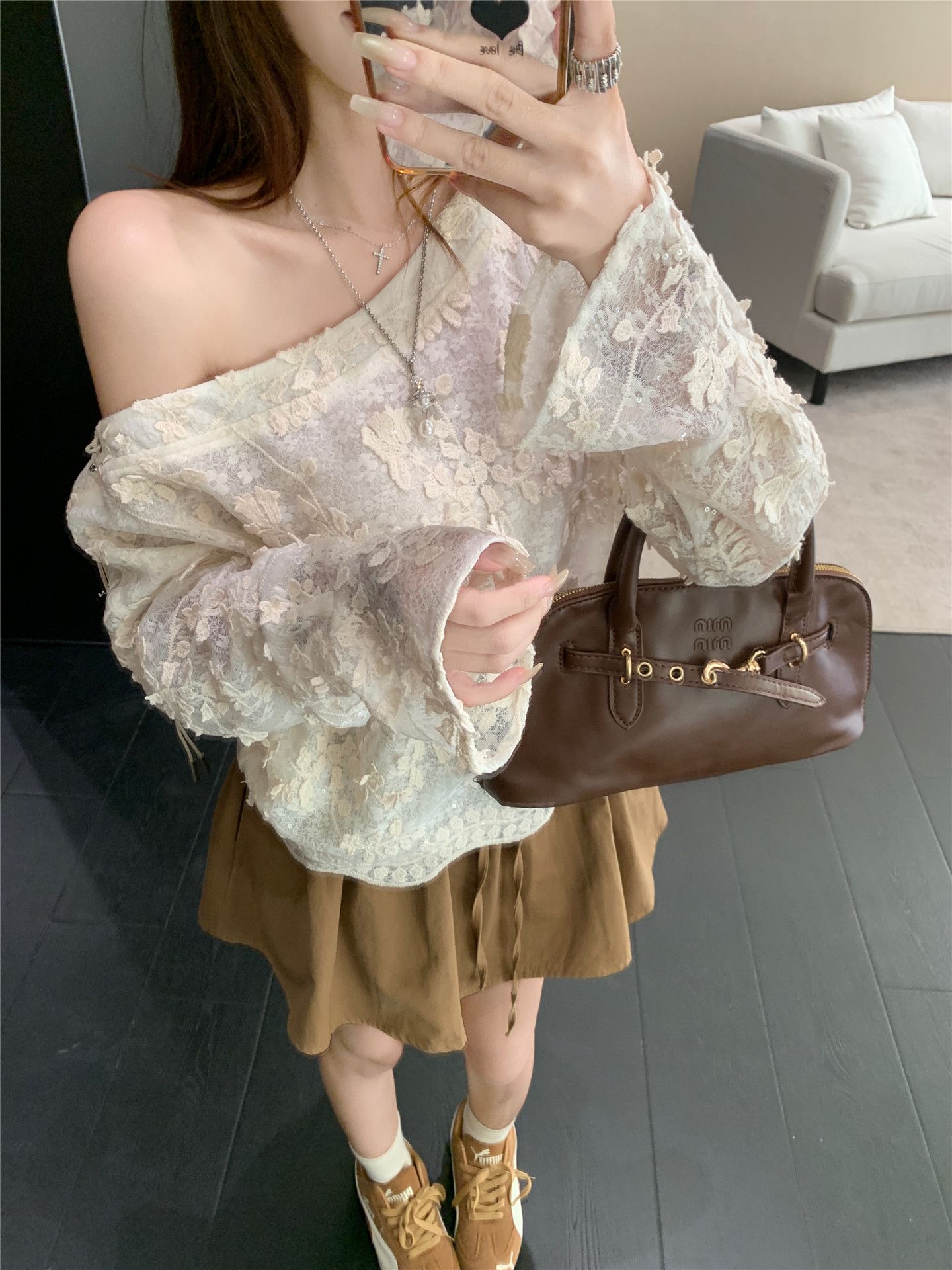 FA46658# 复古重工露肩刺绣长袖蕾丝衫秋季新款设计感小众斜肩打底上衣