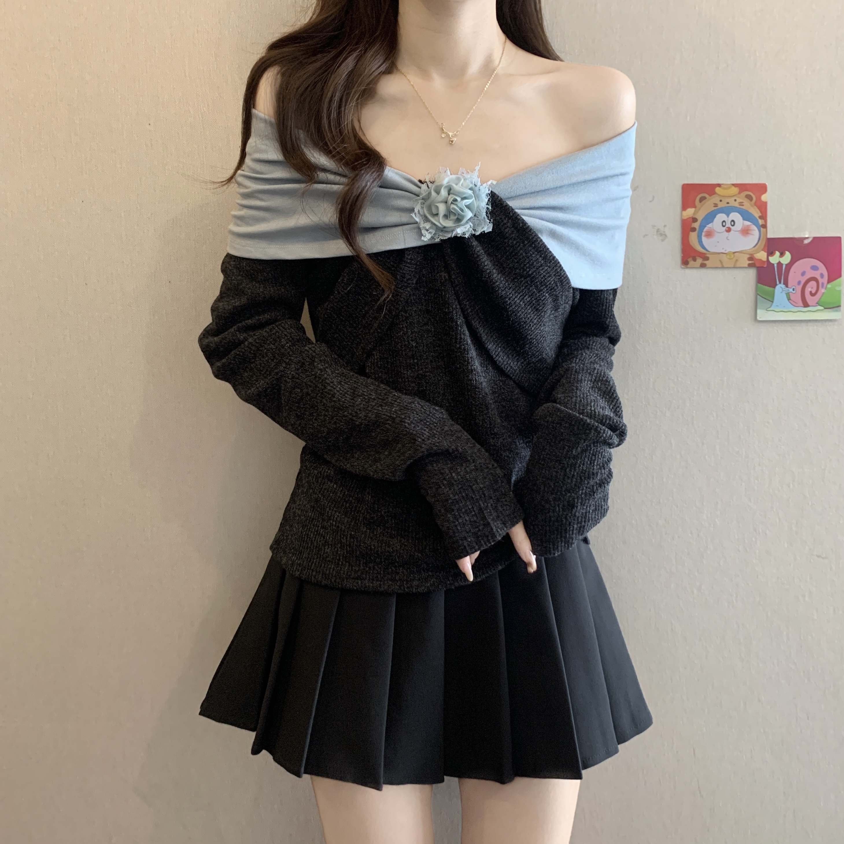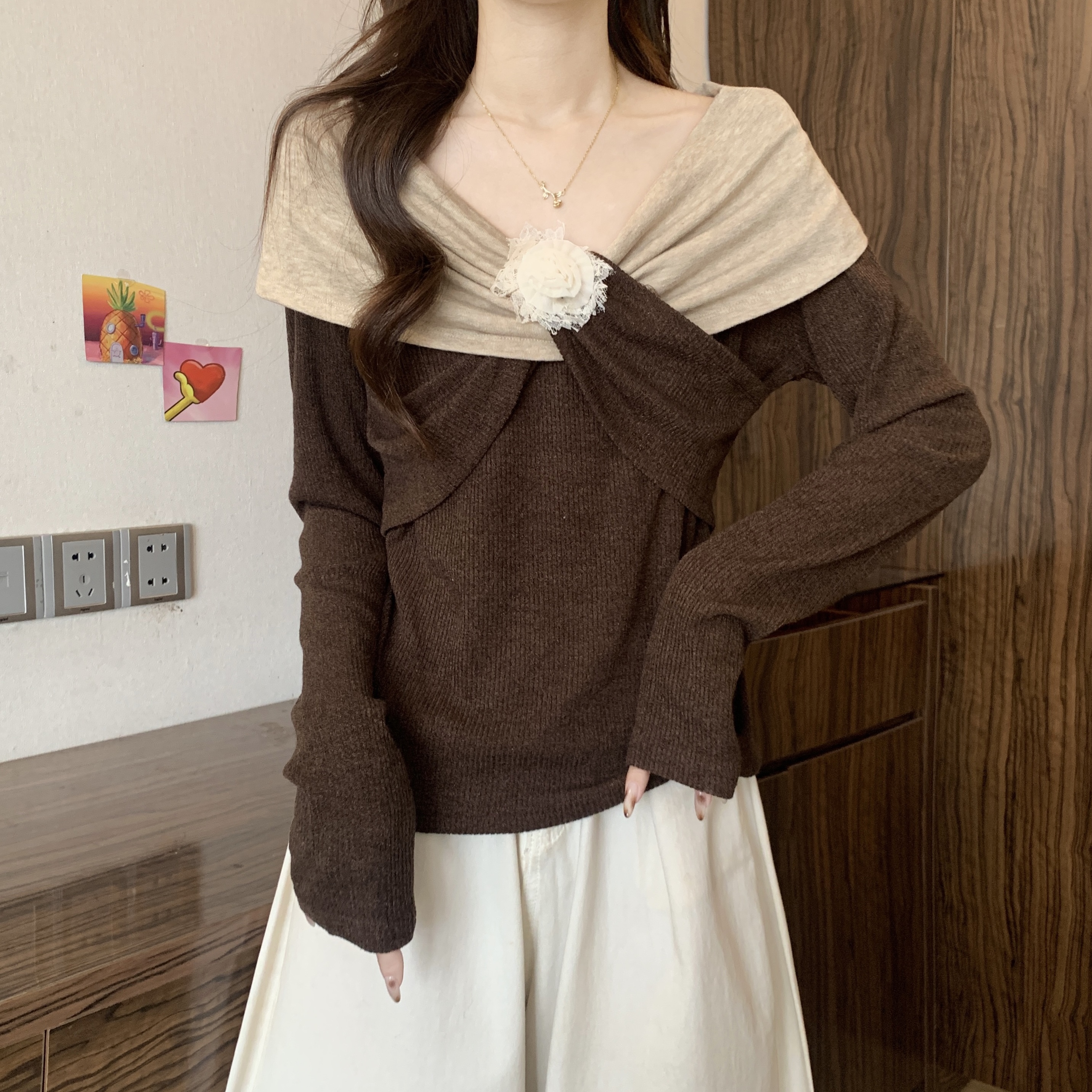 Home > 长袖T恤 > FA46744# 胖MM秋季新款设计感撞色拼接扭结手工花朵收腰显瘦打底衫 服裝批發女裝批發服飾貨源