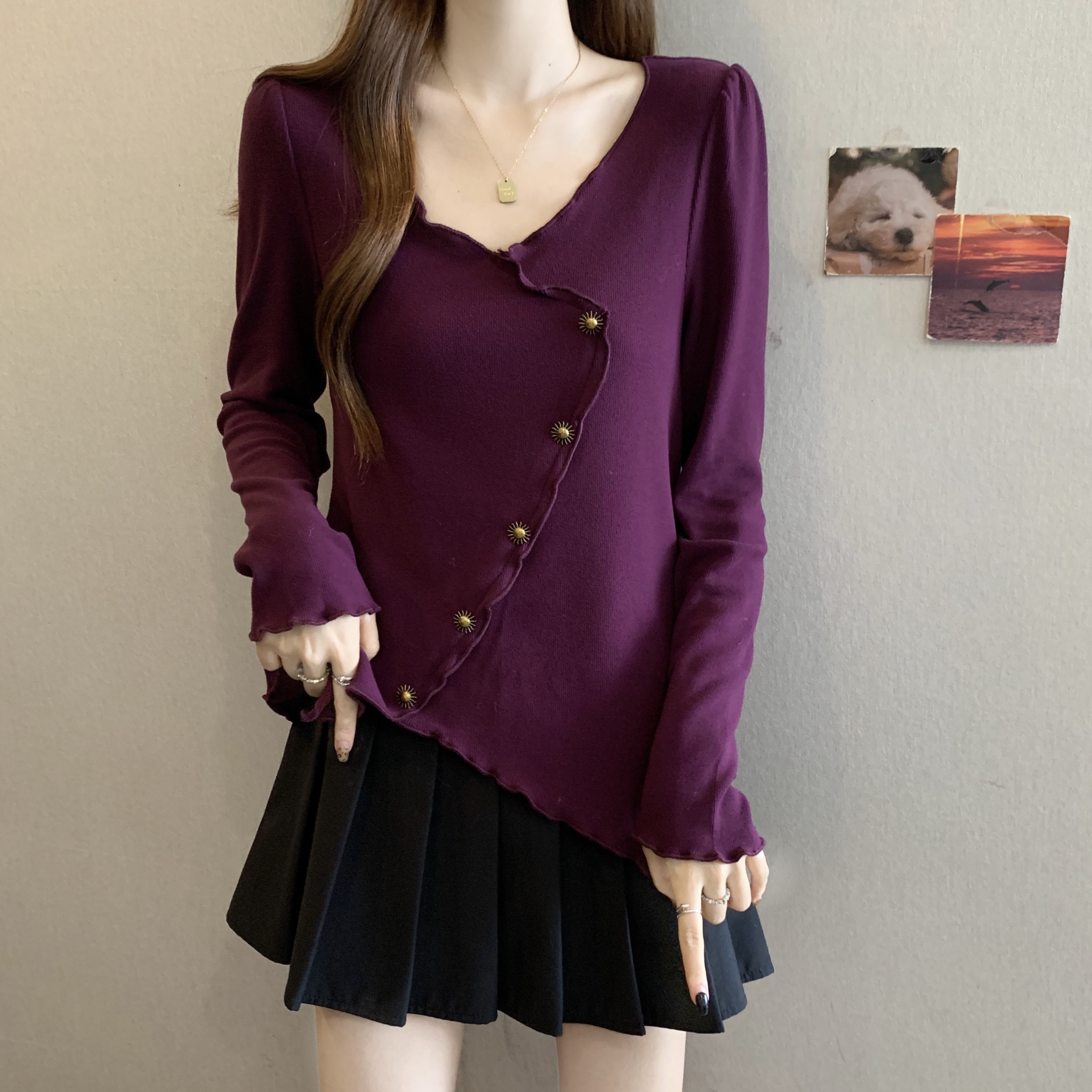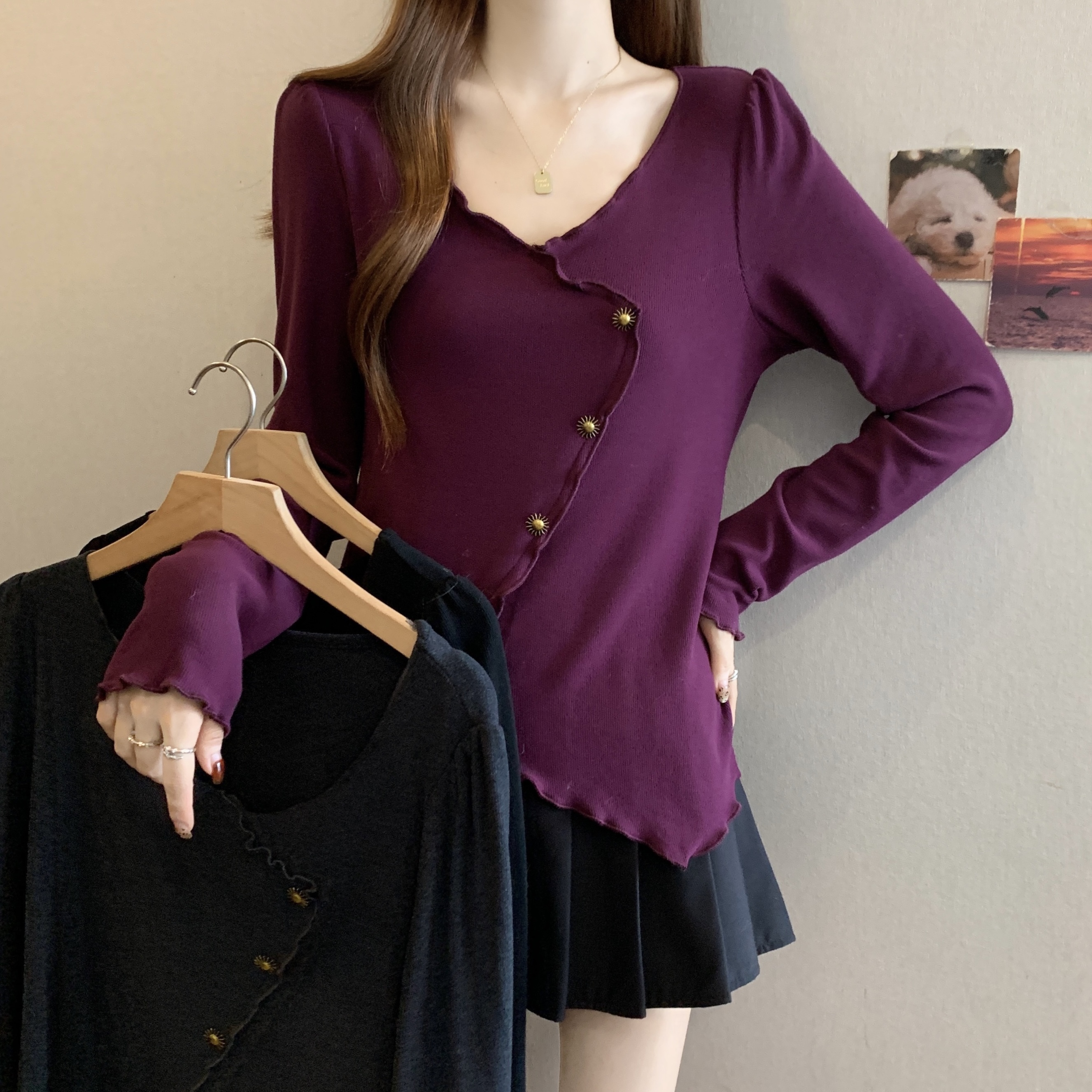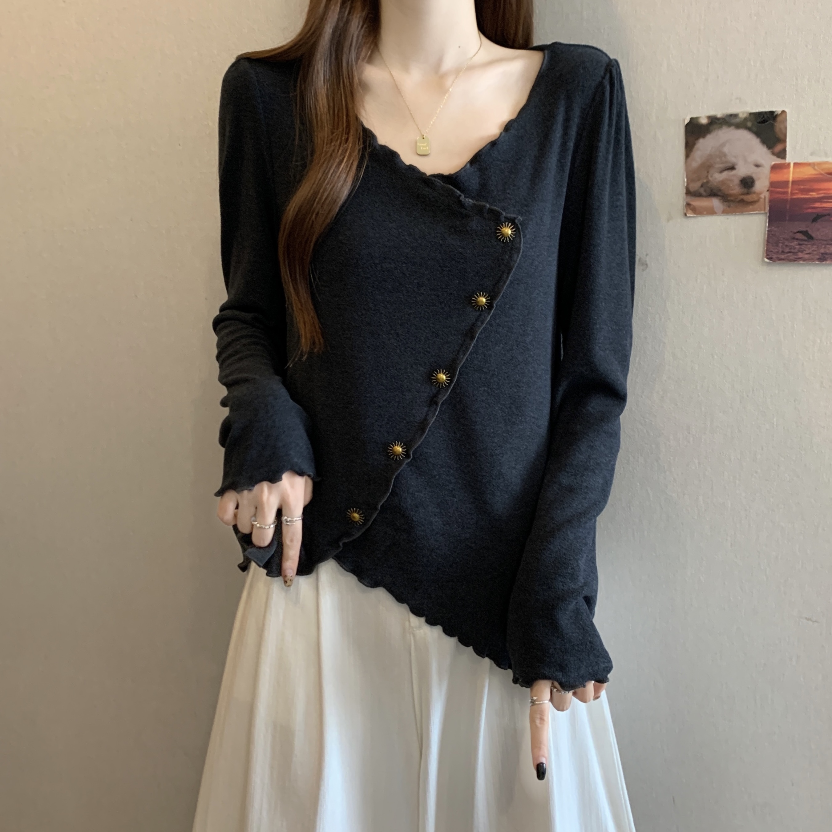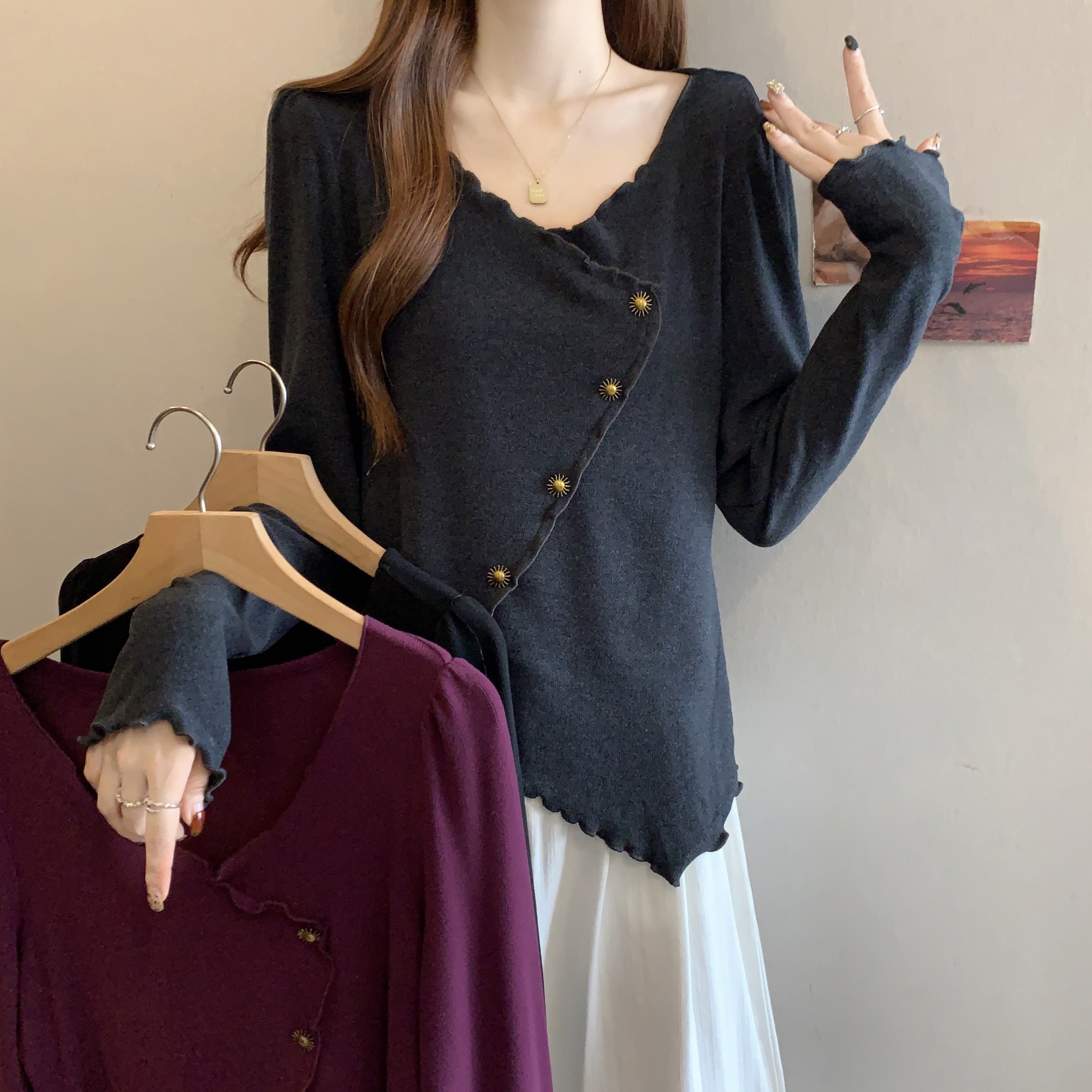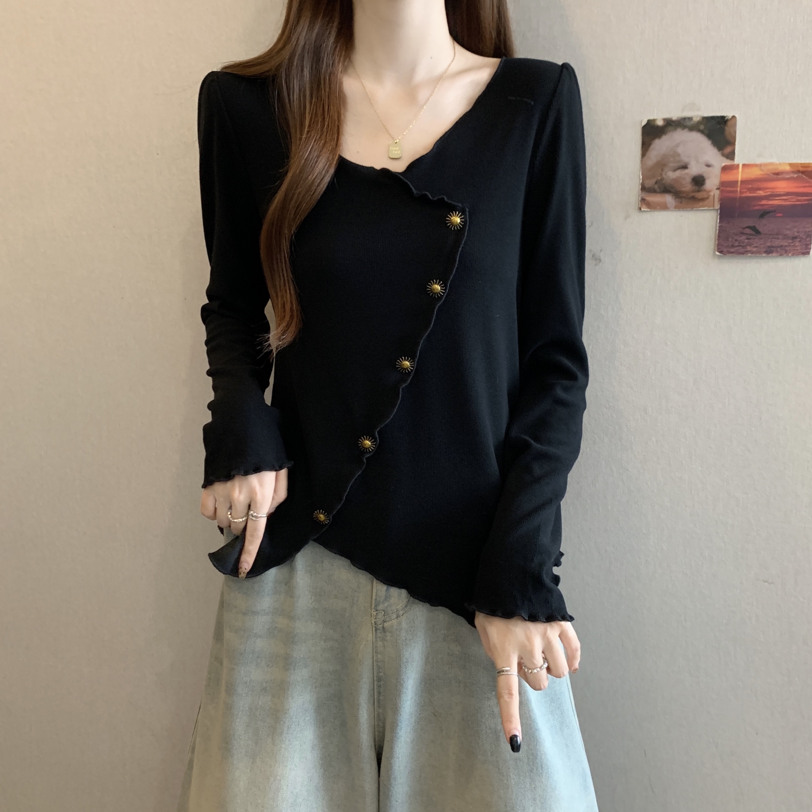 Home > 长袖T恤 > FA46765# 秋季新款胖MM木耳边V领设计感不规则遮肉显瘦小众百搭上衣女 服裝批發女裝批發服飾貨源
