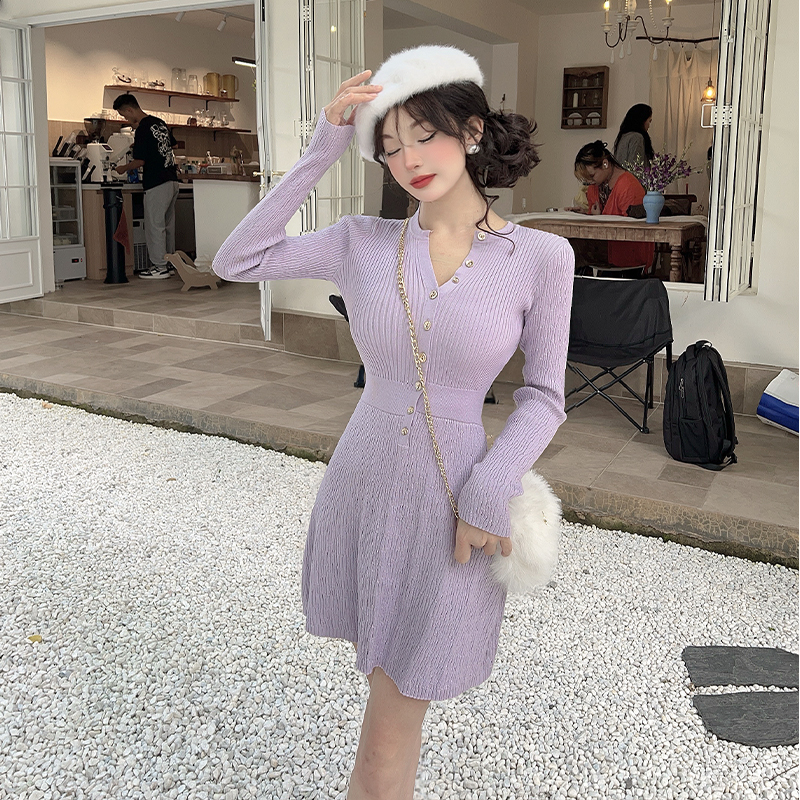 FA46684# 韩系慵懒紫色针织连衣裙女秋冬新别致独特收腰内搭打底A字裙 服裝批發女裝批發服飾貨源