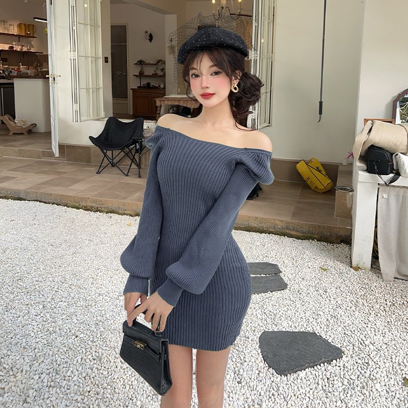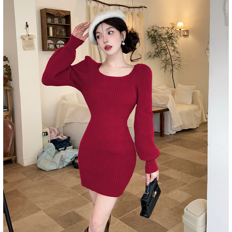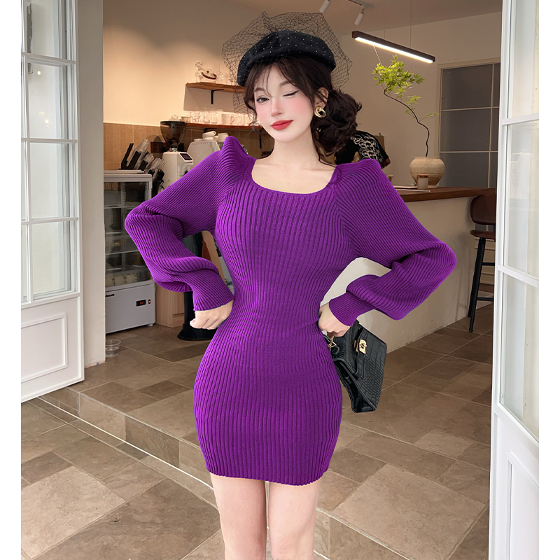 FA46685# 秋冬法式小众泡泡袖方领针织连衣裙女修身显瘦打底包臀短裙子 服裝批發女裝批發服飾貨源