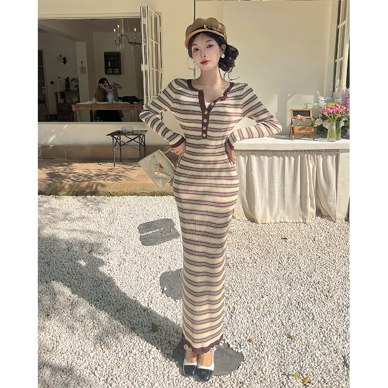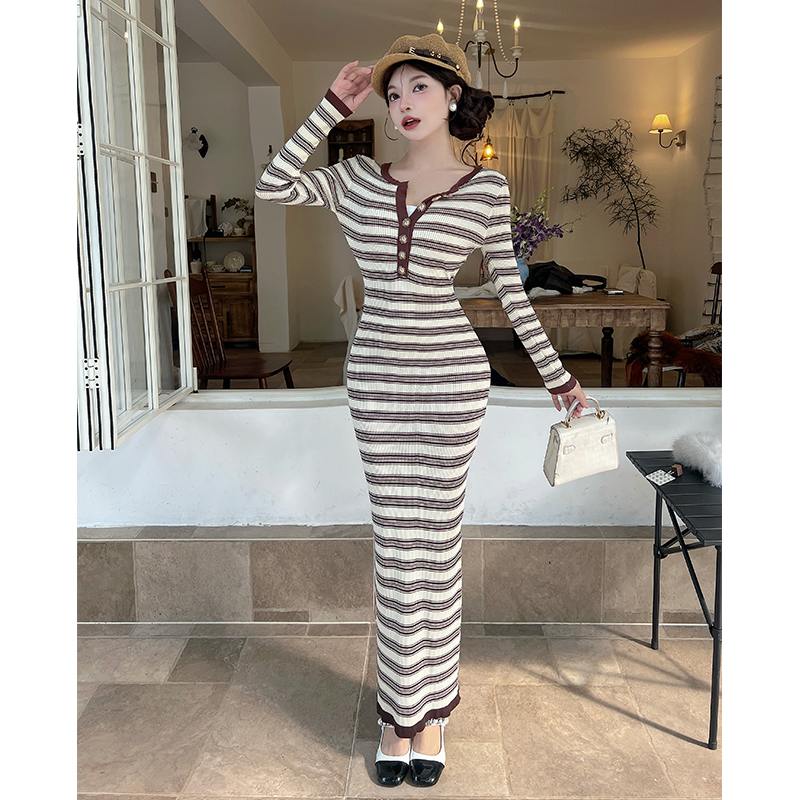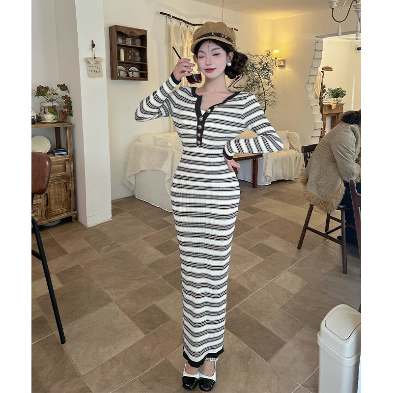 FA46687# 撞色条纹V领长袖打底针织连衣裙女秋冬配大衣修身气质长裙子 服裝批發女裝批發服飾貨源